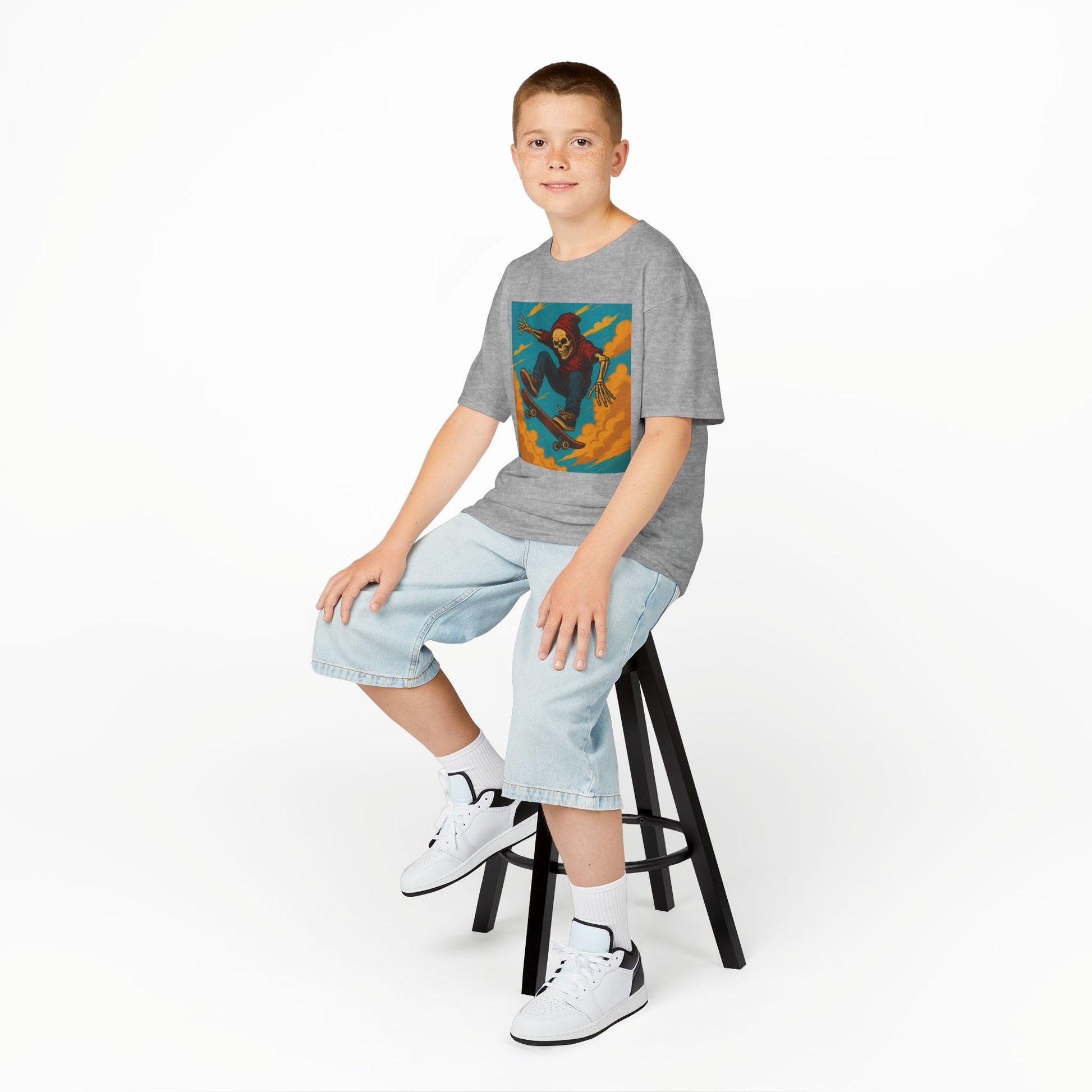 Let your child's style fly high—just like this fearless skeleton in mid-air.This kids shirt features a bold illustration of a skeleton skater mid-jump, wearing a vibrant hoodie and pulling off a gravity-defying trick. Inspired by vintage American comic art, it's made to stand out—with two hoodie color options to suit every little rebel's taste. Whether they're rolling through the skatepark or showing off at school, this shirt is perfect for kids who love bold graphics, skeletons, and streetwear energy. 🧵 Why You'll Love It Available in multiple hoodie colors High-quality print with vivid detail Comic-style skeleton on skateboard Made with soft, kid-friendly fabric Great for birthdays, school, or skate sessions Designed to turn heads and spark conversations 🎁 Perfect For: Boys and girls who love skater style Parents seeking unique, artsy kidswear Creative kids who love cool, bold fashion Gift-givers looking for something truly original