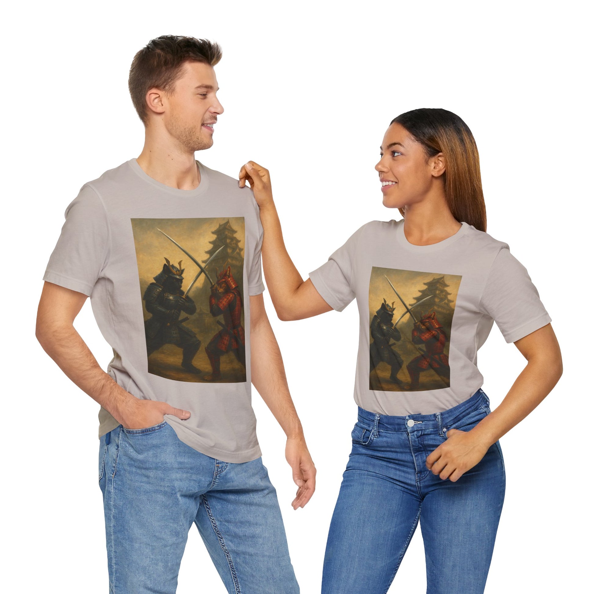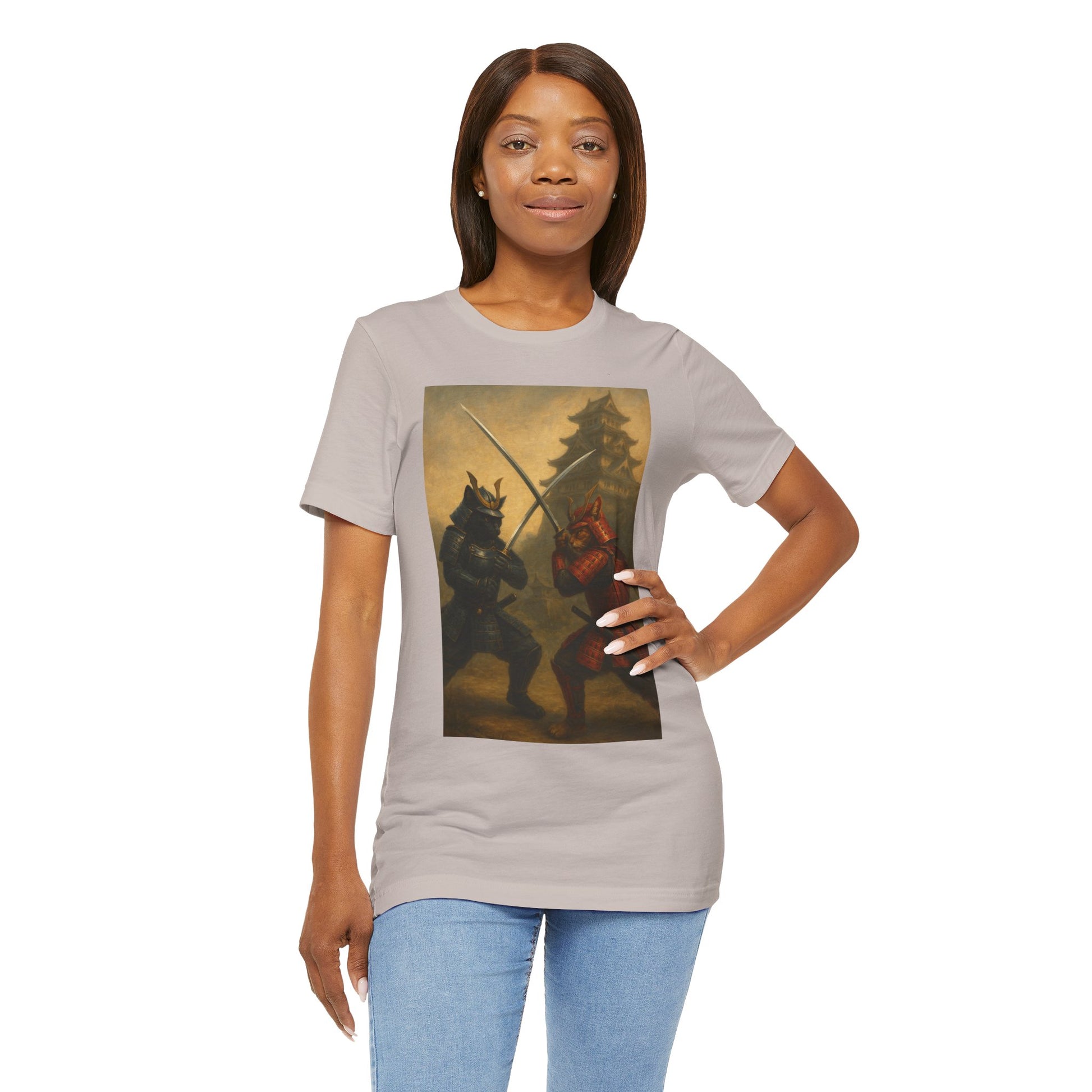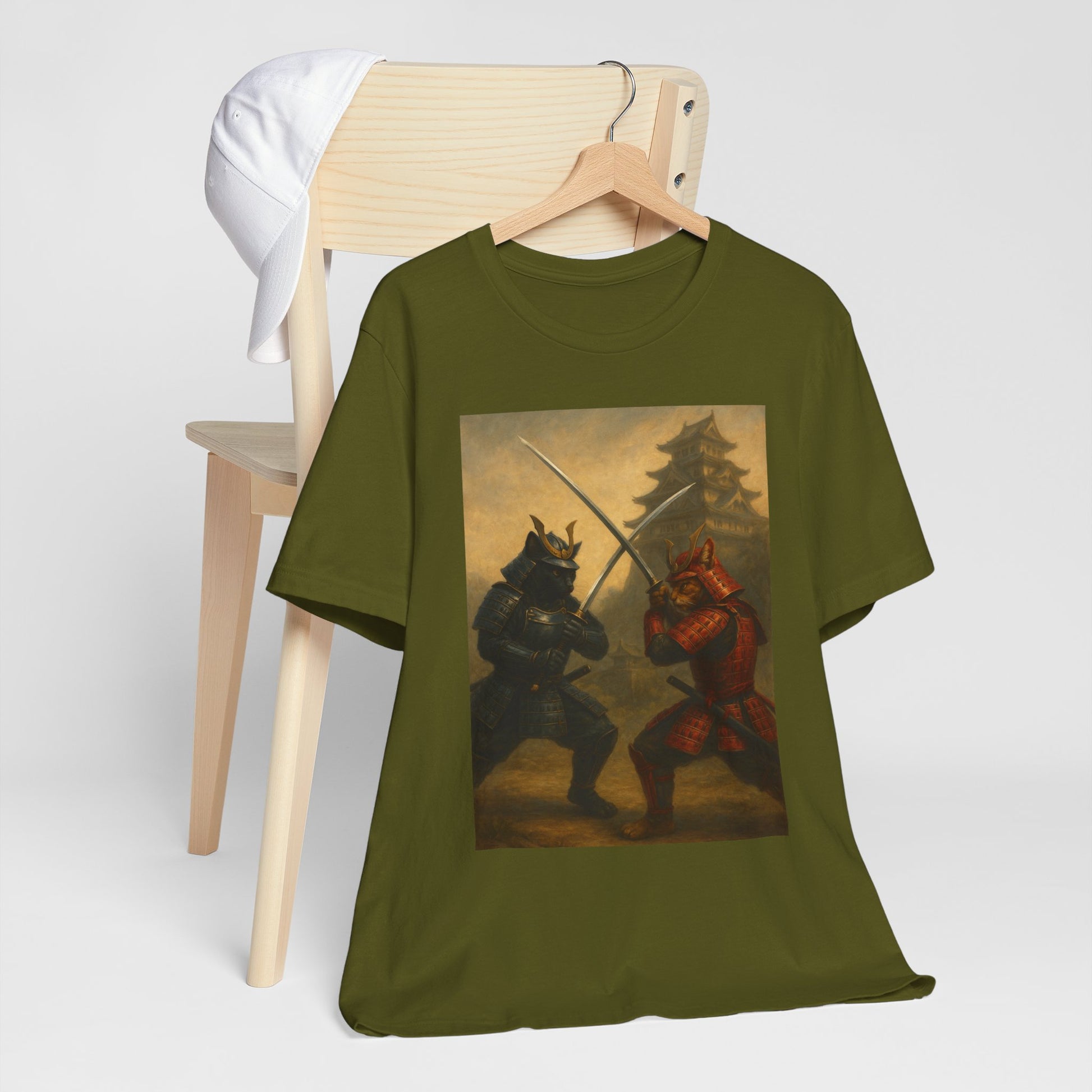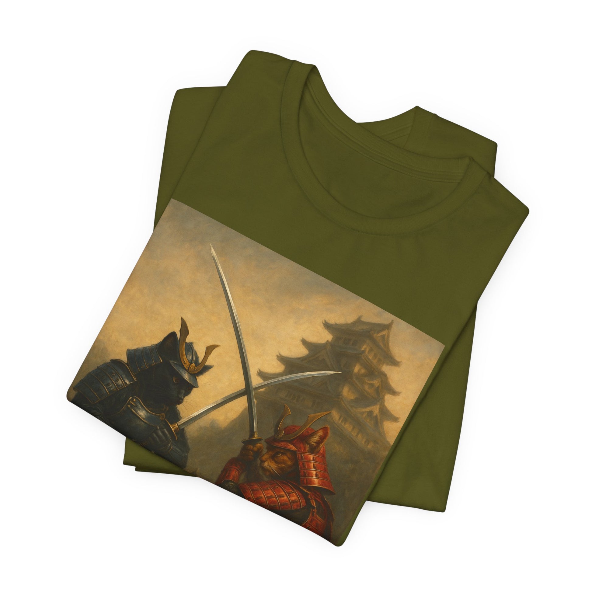 Epic Cat Samurai Battle Tee - War Horses Clash in Front of Japanese Castle Feline Warrior Art Shirt for Fantasy & Japan Lovers