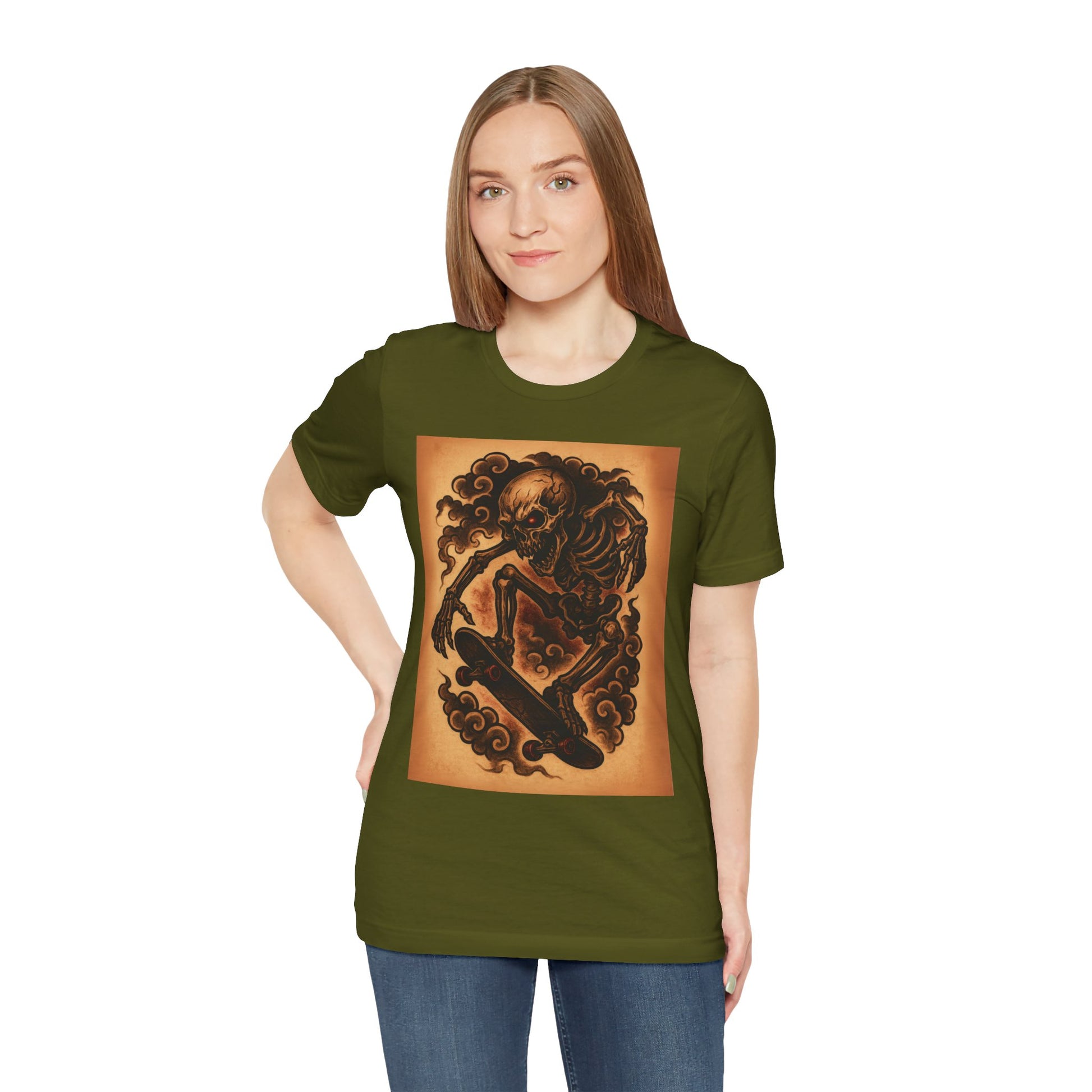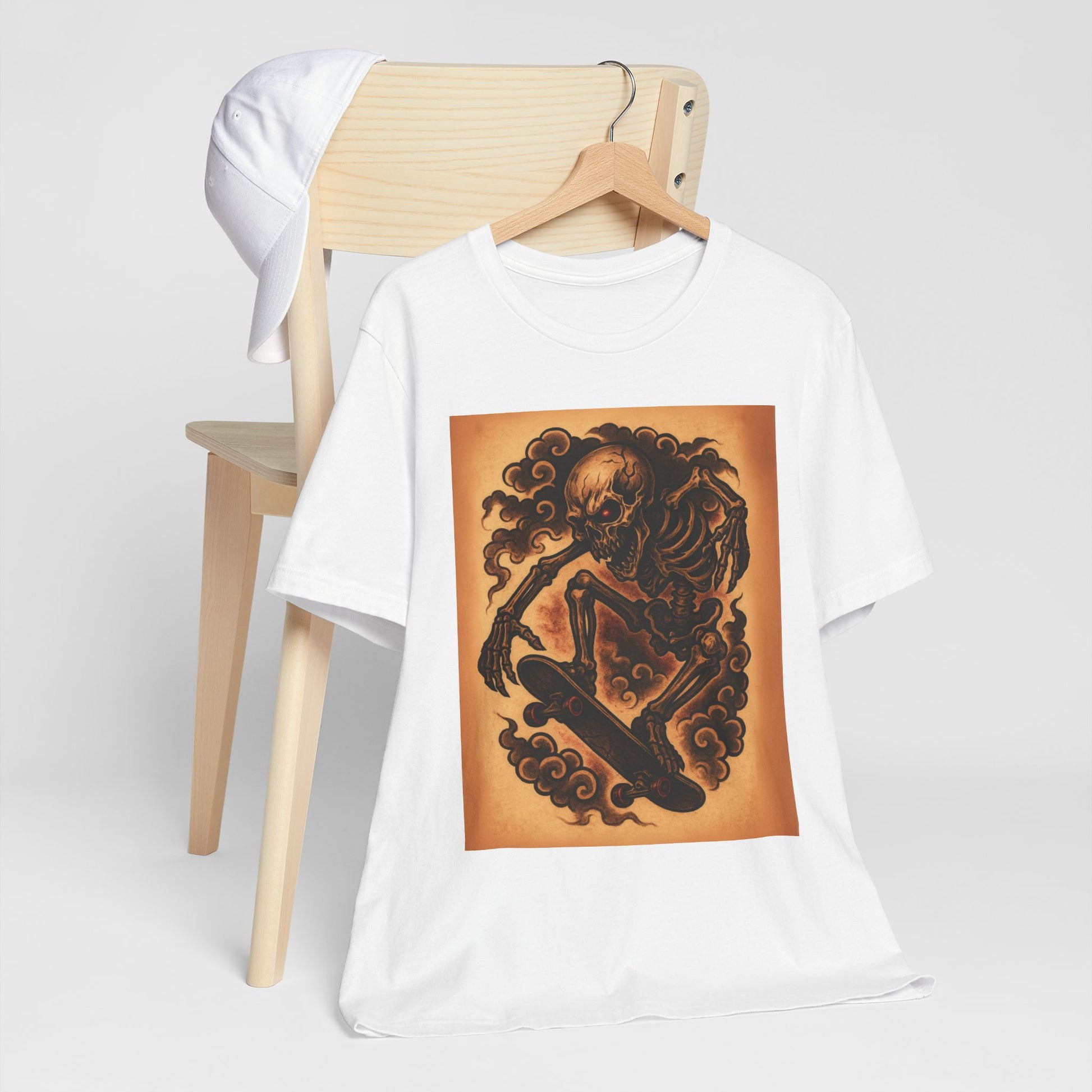A horror yokai skeleton graphic tee with tattoo-style shading and a skateboard jump moment—ideal streetwear for adults and a standout skater dad gift.