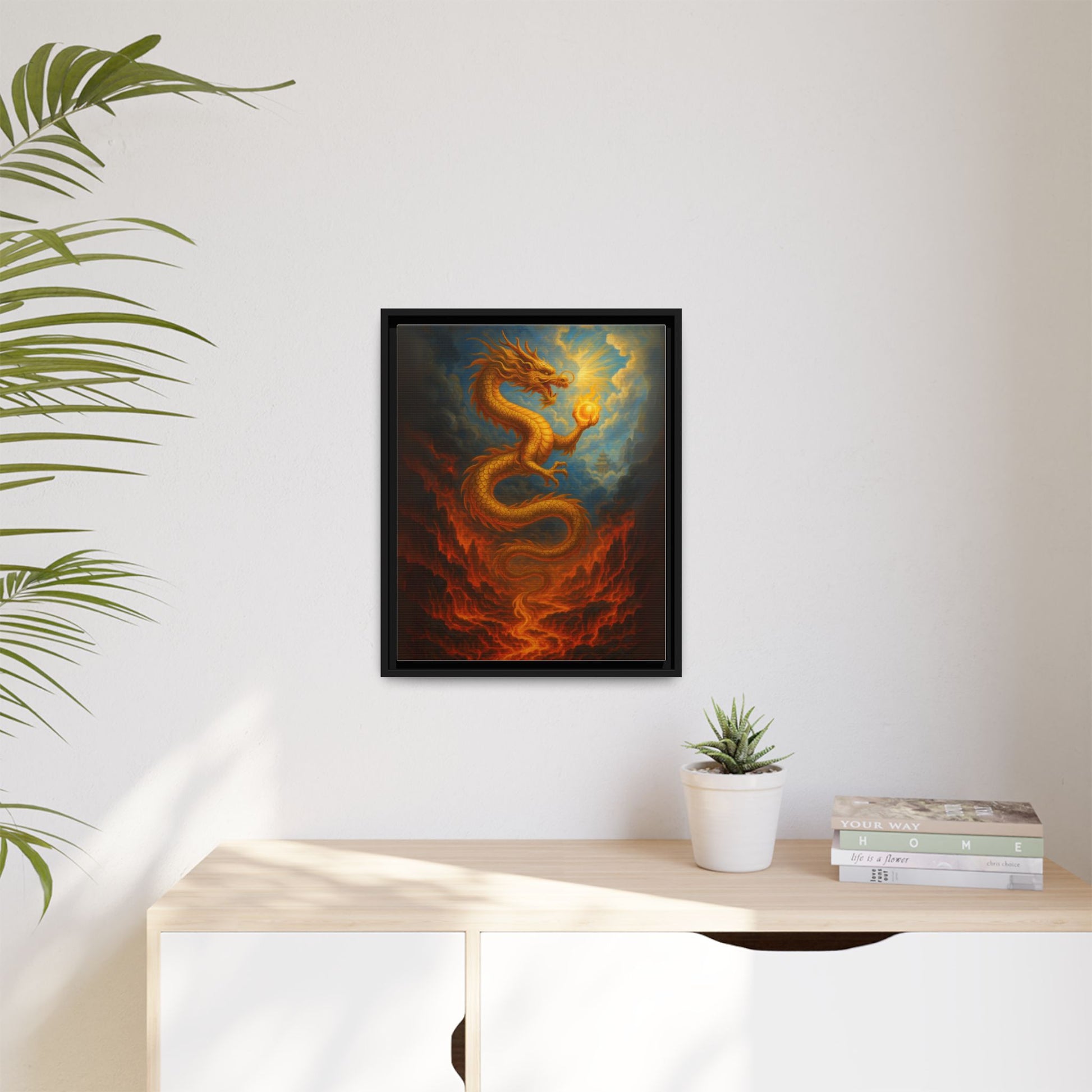 A coiled golden dragon climbs from a river of fire, clutching a glowing pearl as clouds open to light and a distant temple. Painted with rich scales and warm highlights, this gallery-ready canvas brings mythic energy to modern rooms without shouting.