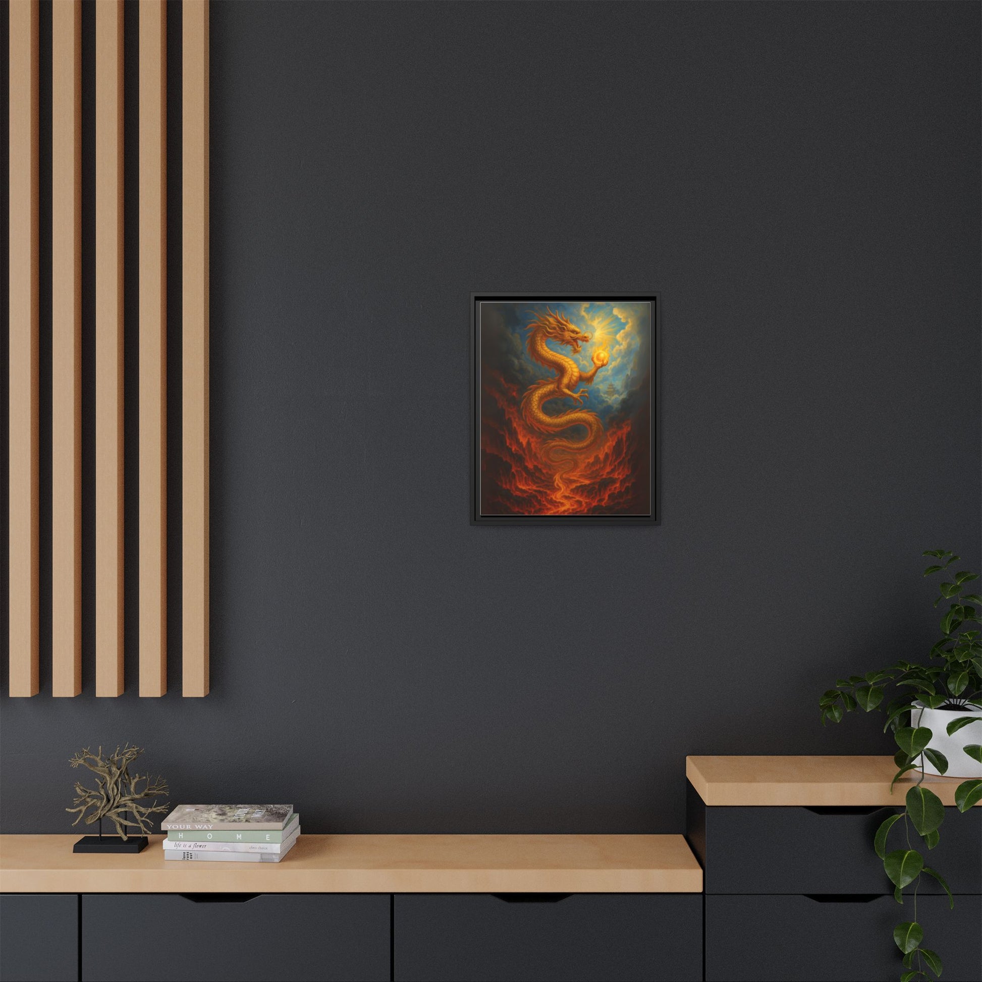 Golden Dragon Canvas Feng Shui Wall Art Asian Myth Painting Fire and Cloud Temple Inspired Good Luck Decor Gift for Dad