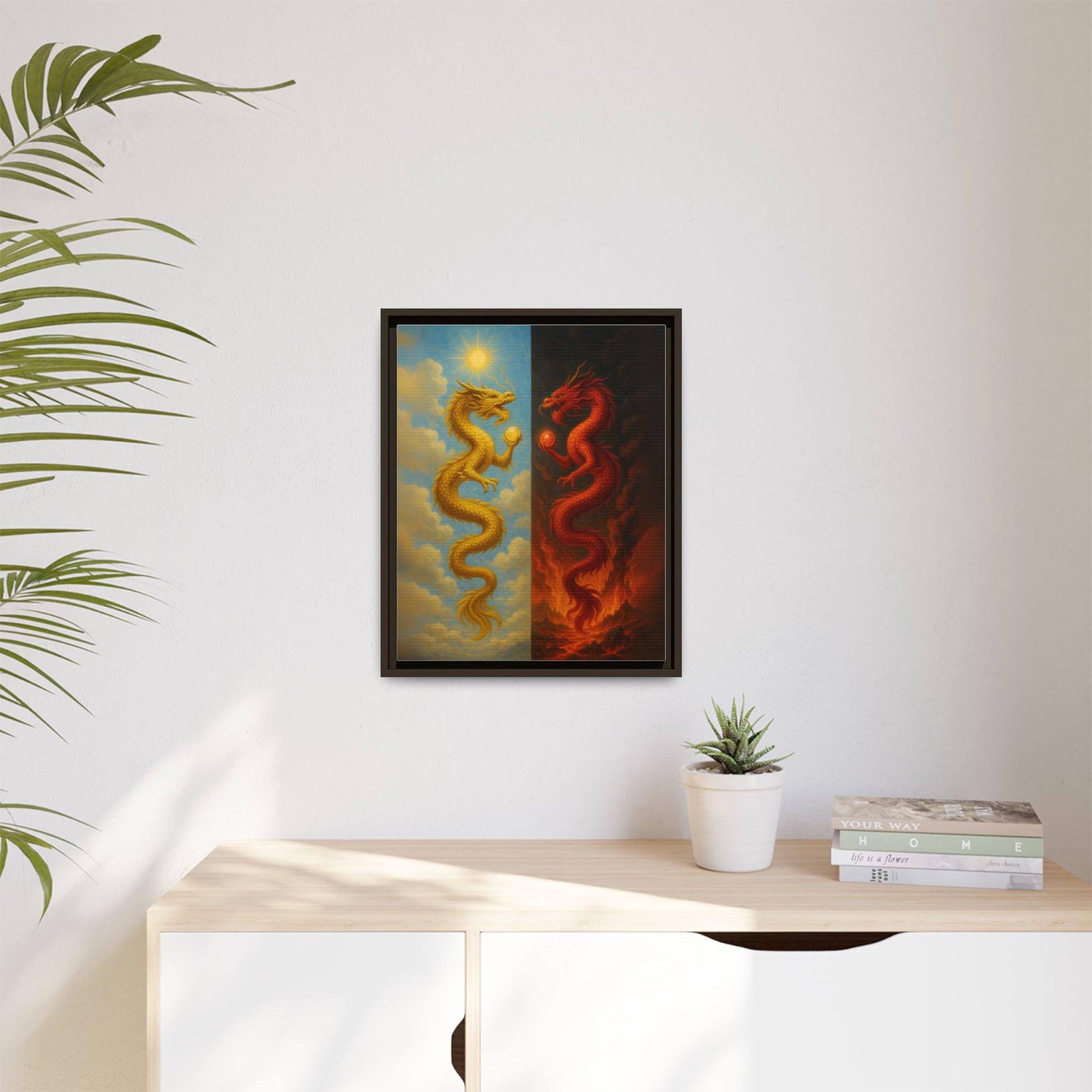This statement canvas splits the world in two a golden dragon rising through bright clouds and sun on the left and a red dragon coiling over fire on the right. Each lifts a glowing pearl. The high contrast palette makes the piece read across the room and photograph beautifully for gifting and reviews. It resonates with dragon lovers feng shui shoppers design minded dads and new homeowners seeking art that feels like momentum harmony and protection.