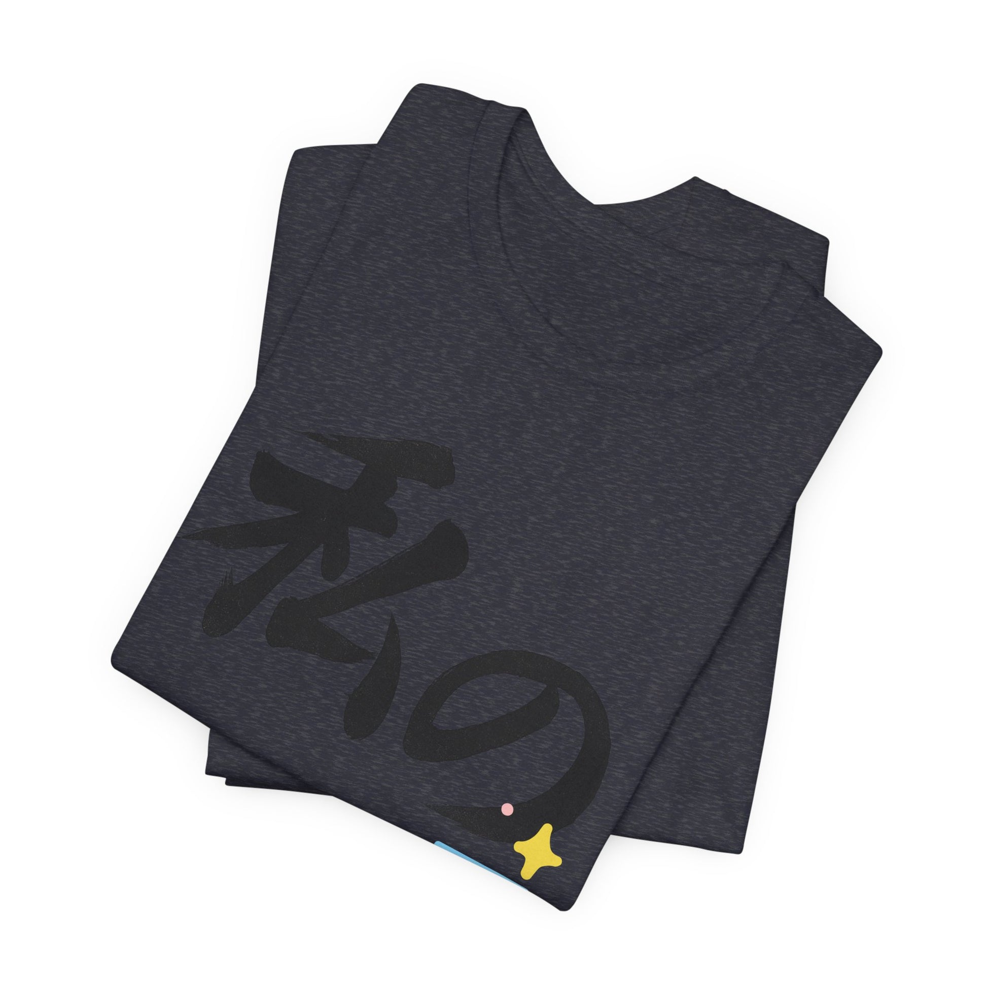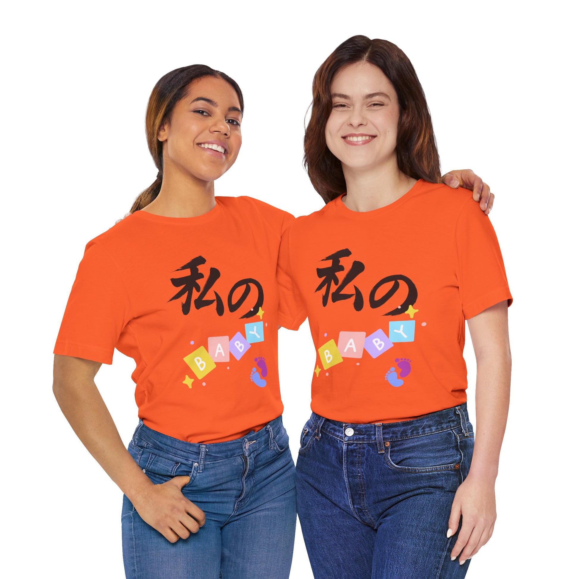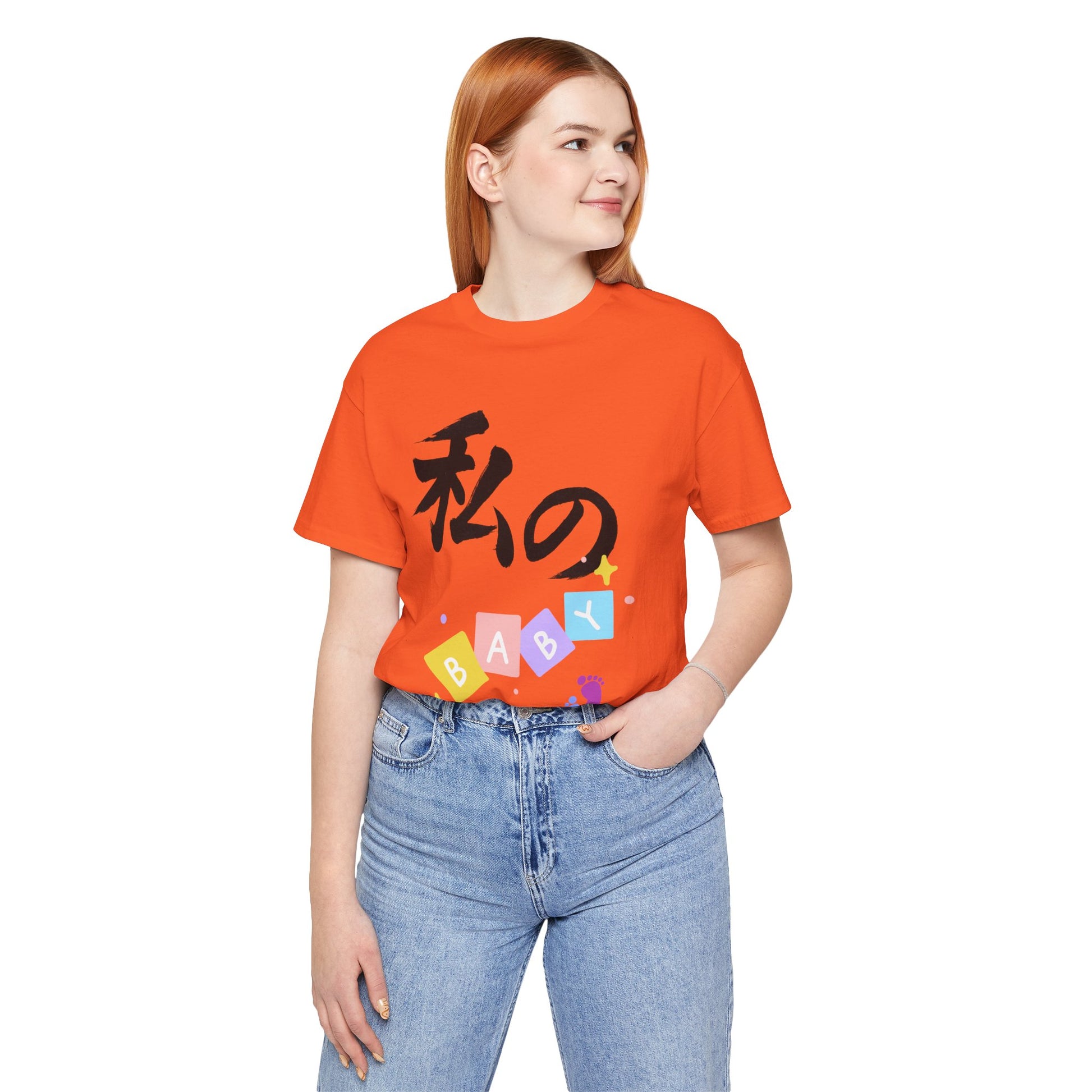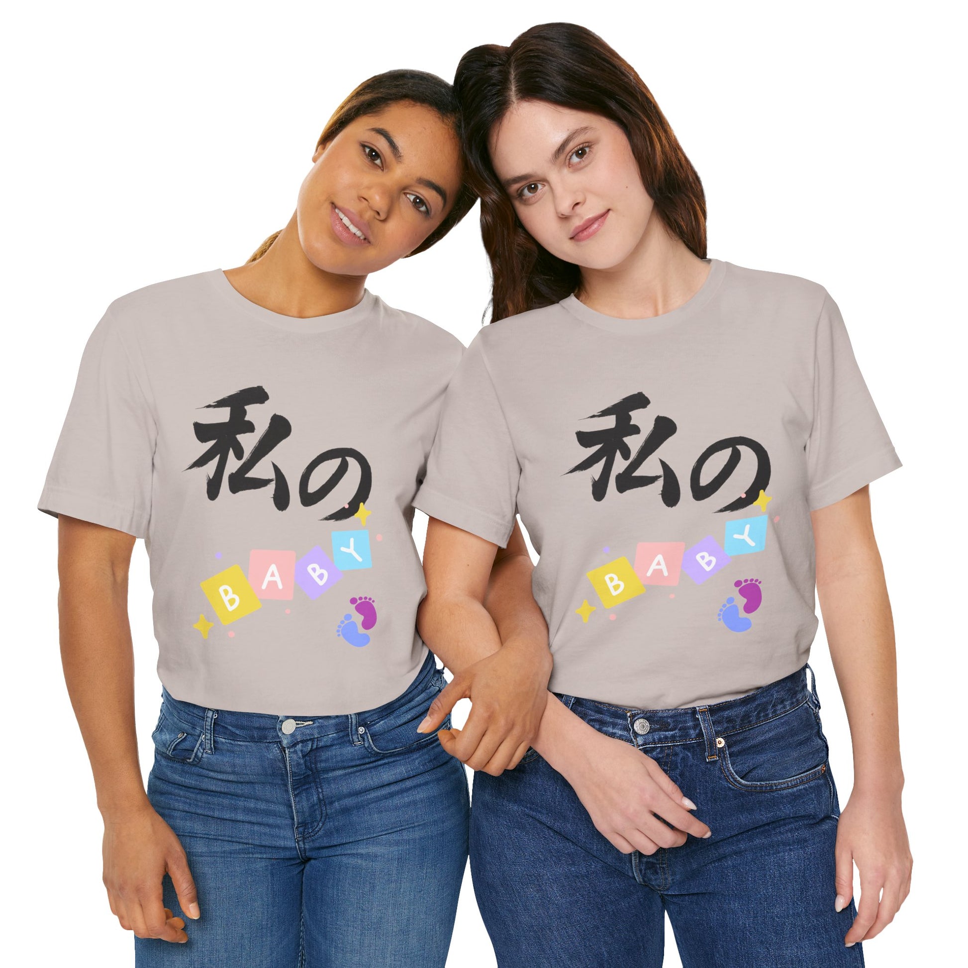 Stroller walk, sunlight on the sidewalk, your friend snaps the first pic. The bold kanji across your chest reads “Watashi no”—Japanese for “my.” Paired with pastel tiles that spell BABY, the design simply says “My baby.” It blends authentic brush calligraphy with nursery-cute color, made for proud new or expecting moms.