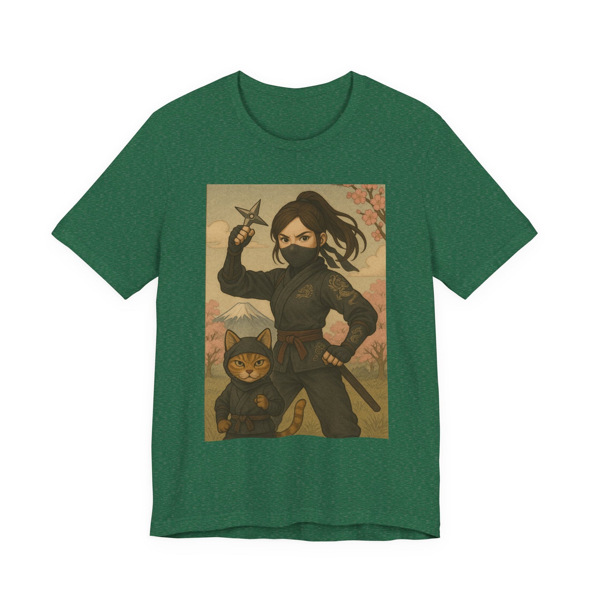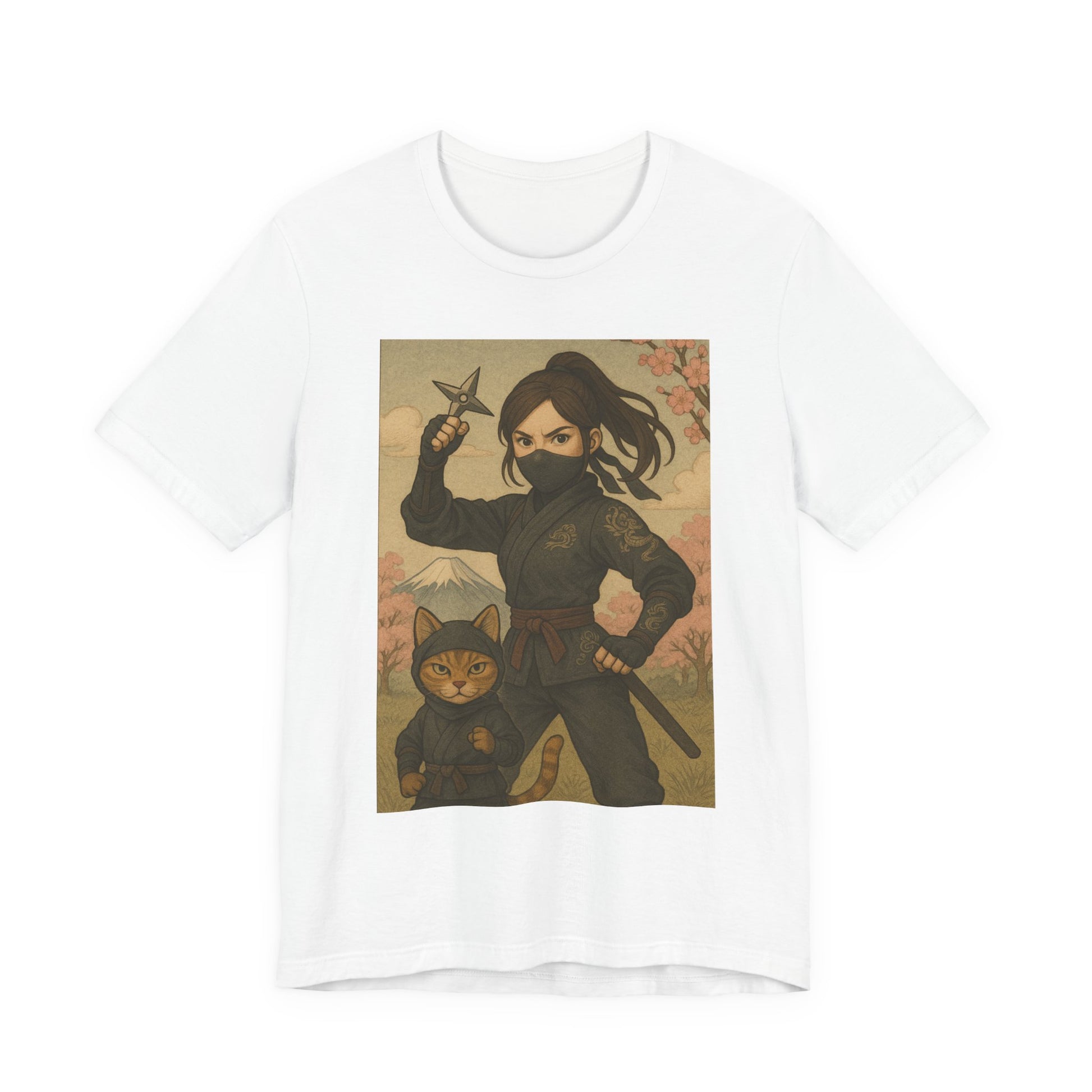 Ninja and Cat T-Shirt - Female Ninja in Black Outfit with Shuriken-Japanese Samurai Style, Mount Fuji, Cherry Blossoms-Cool Unisex Anime Tee