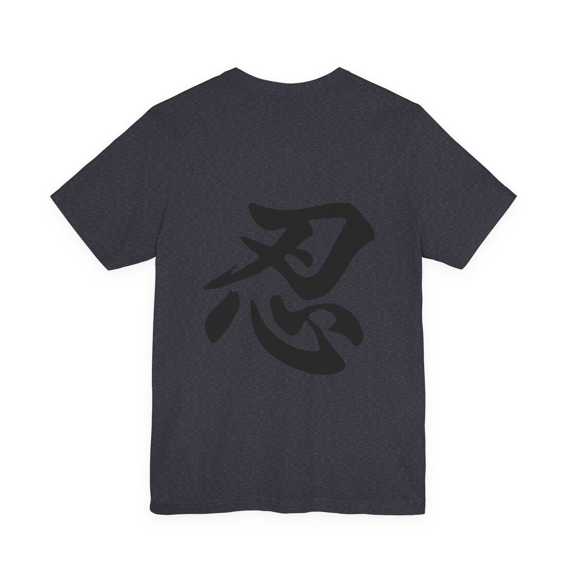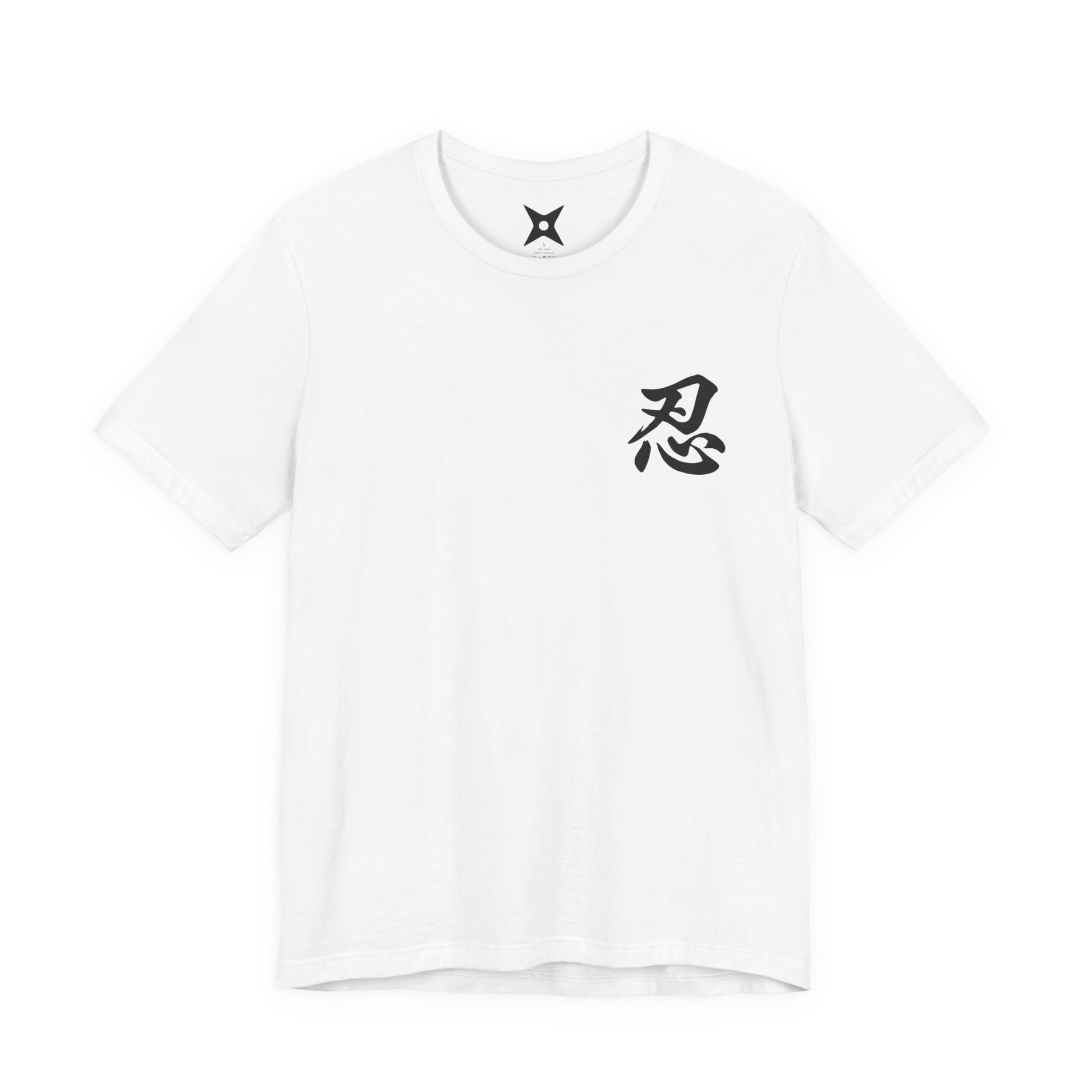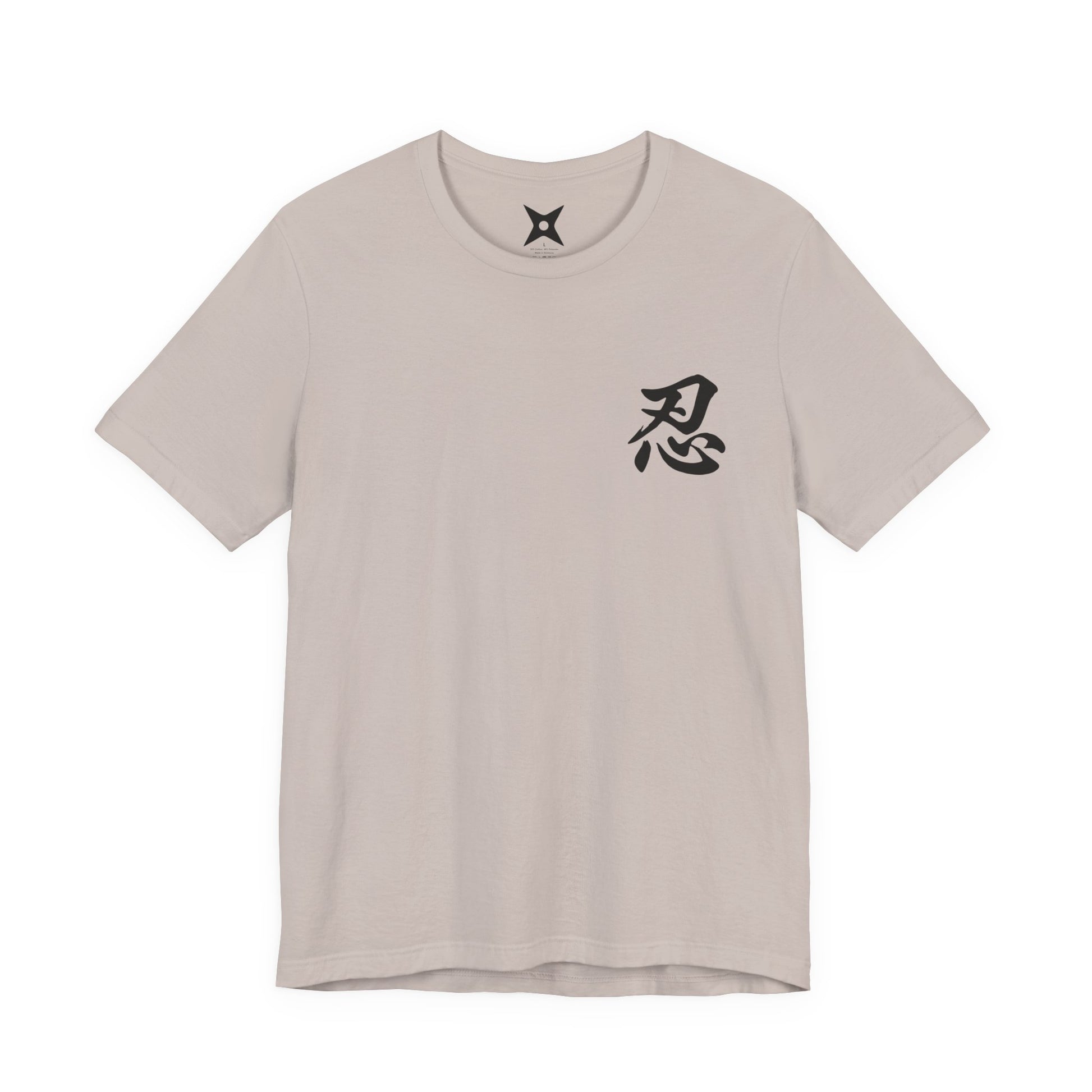 The front of the shirt showcases the powerful kanji symbol, and the back features a sleek shuriken (ninja star) icon for a subtle, authentic touch.