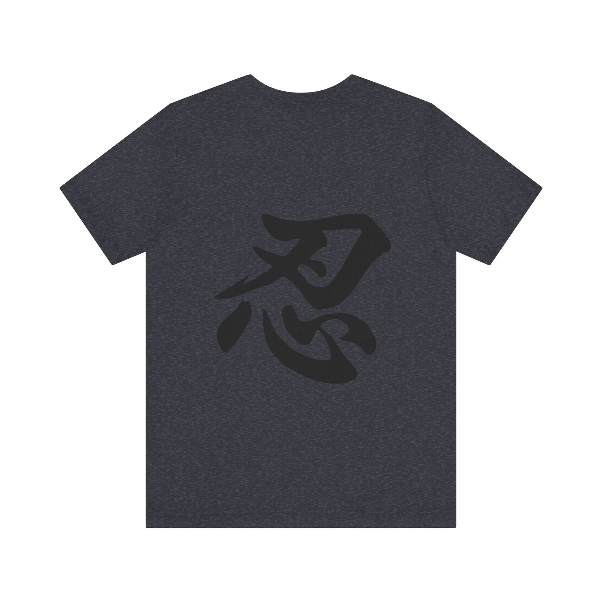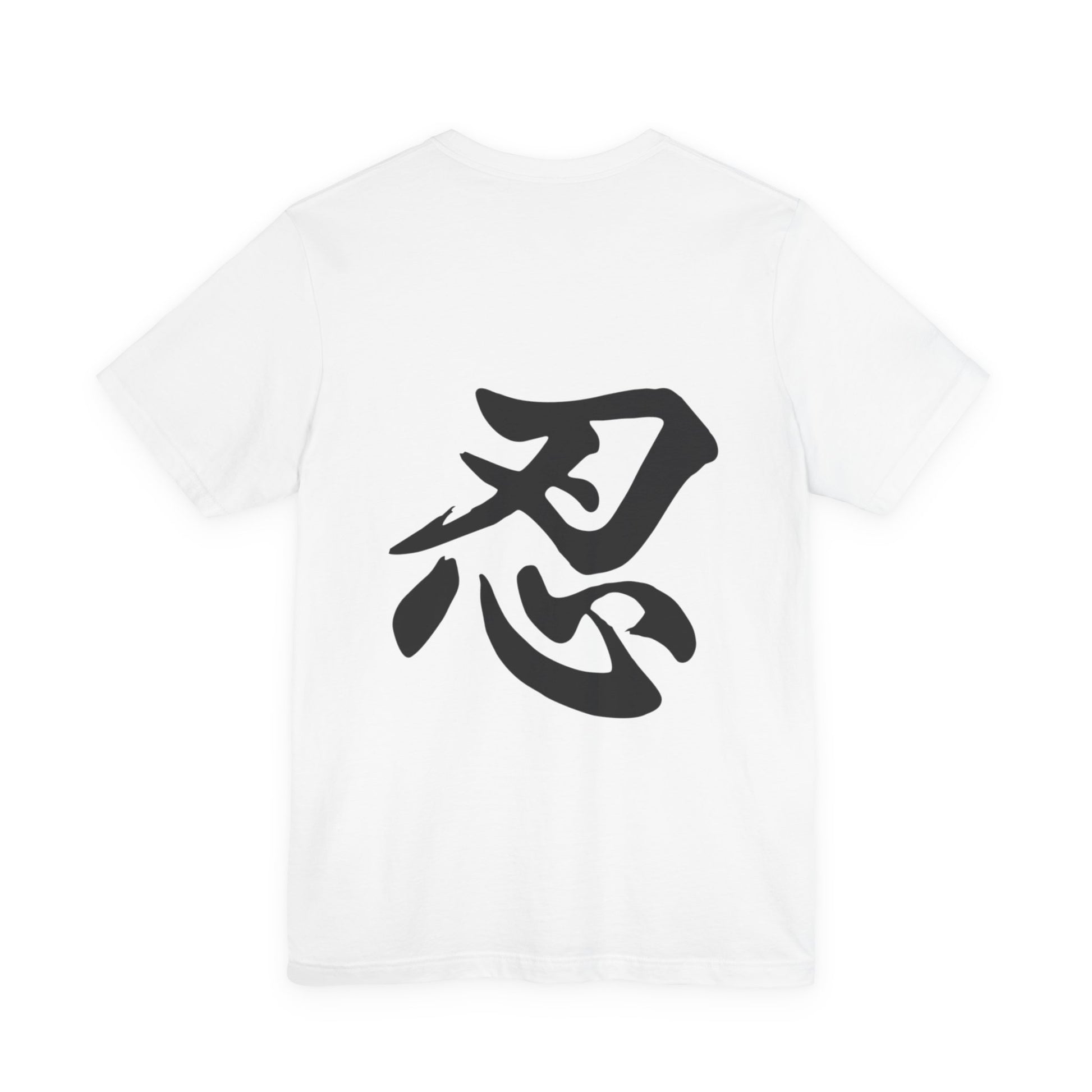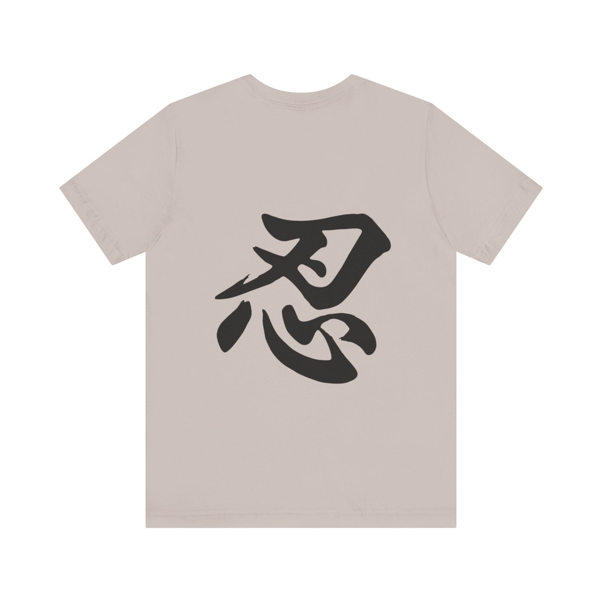 The front of the shirt showcases the powerful kanji symbol, and the back features a sleek shuriken (ninja star) icon for a subtle, authentic touch.