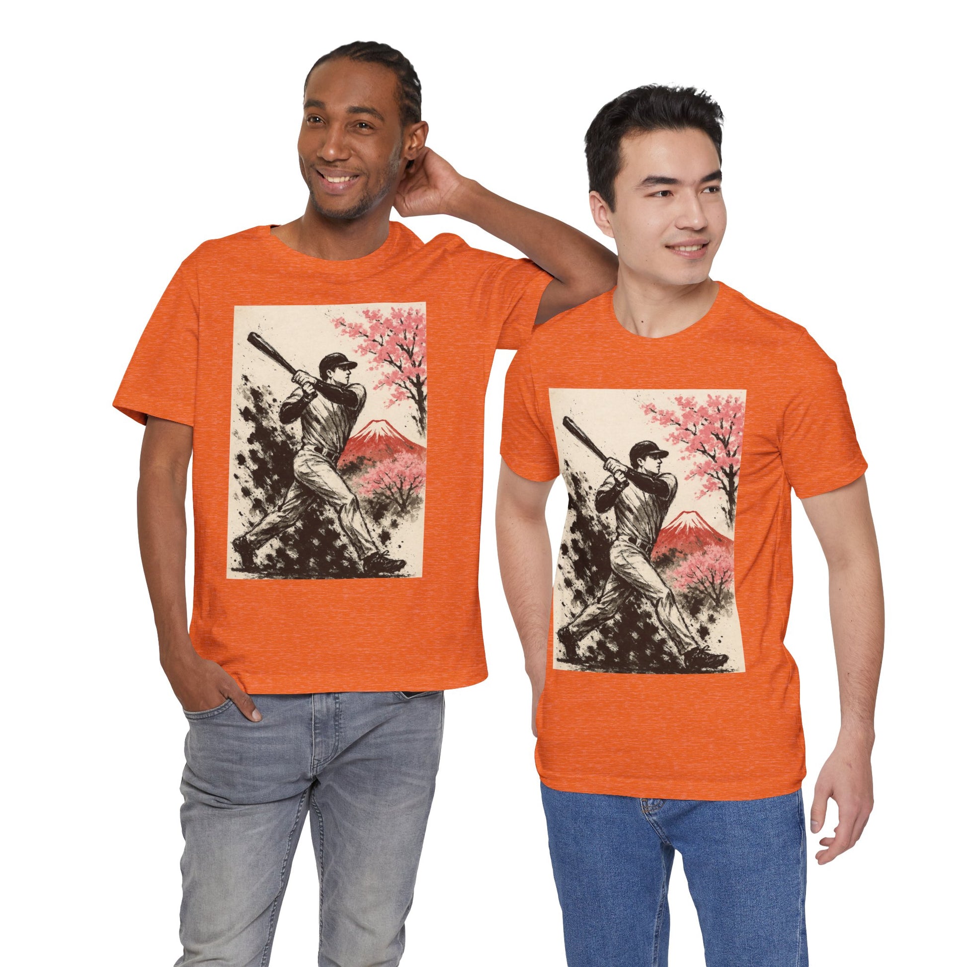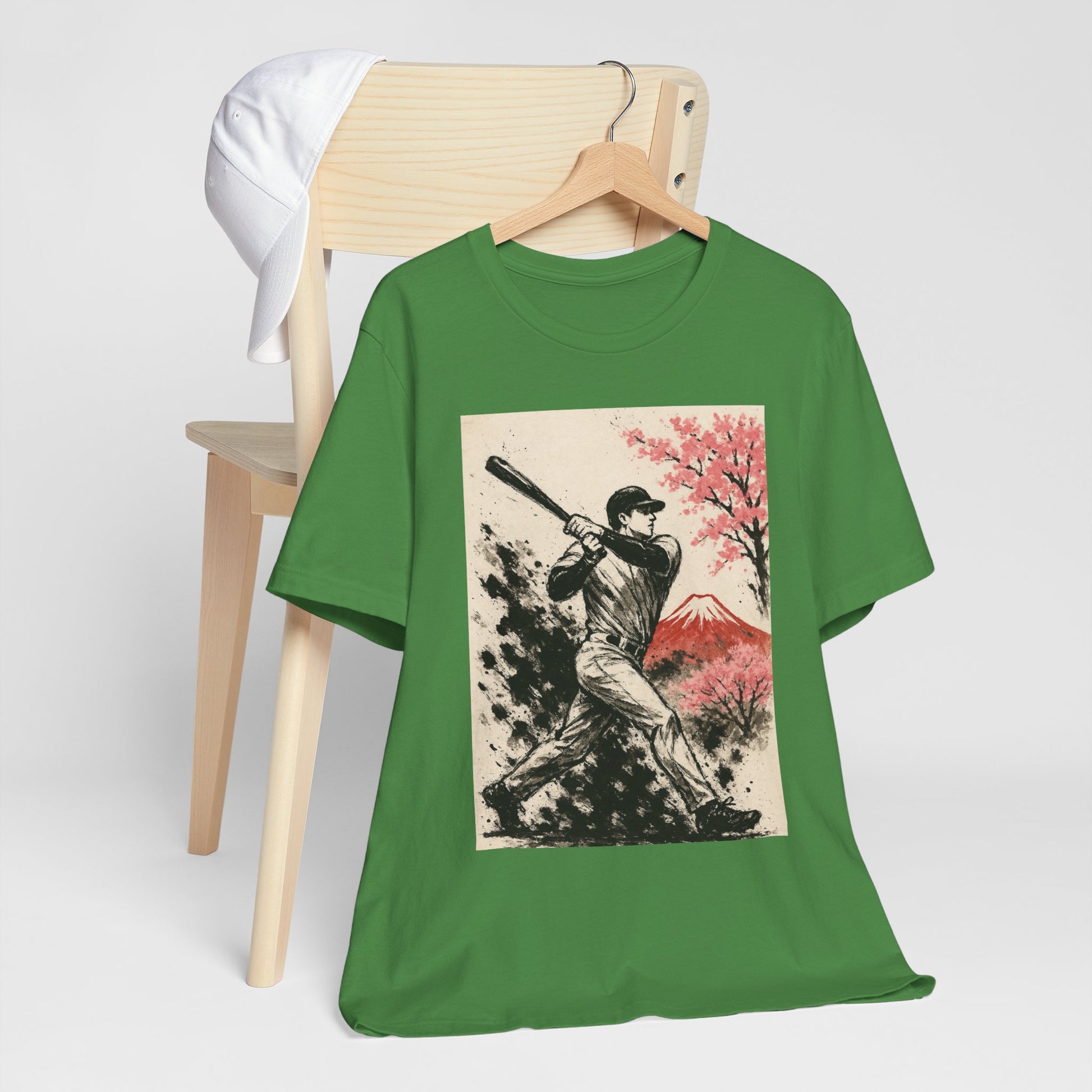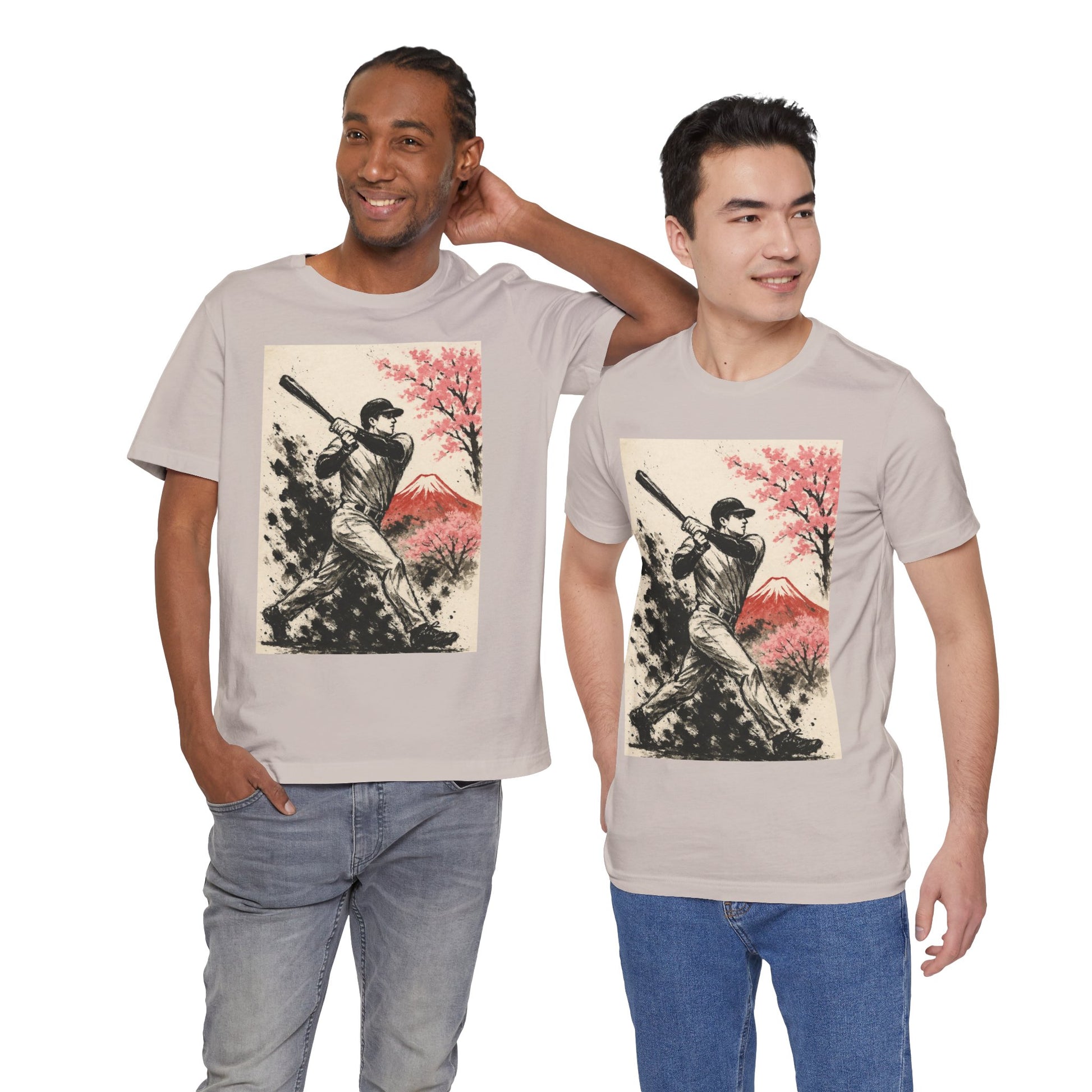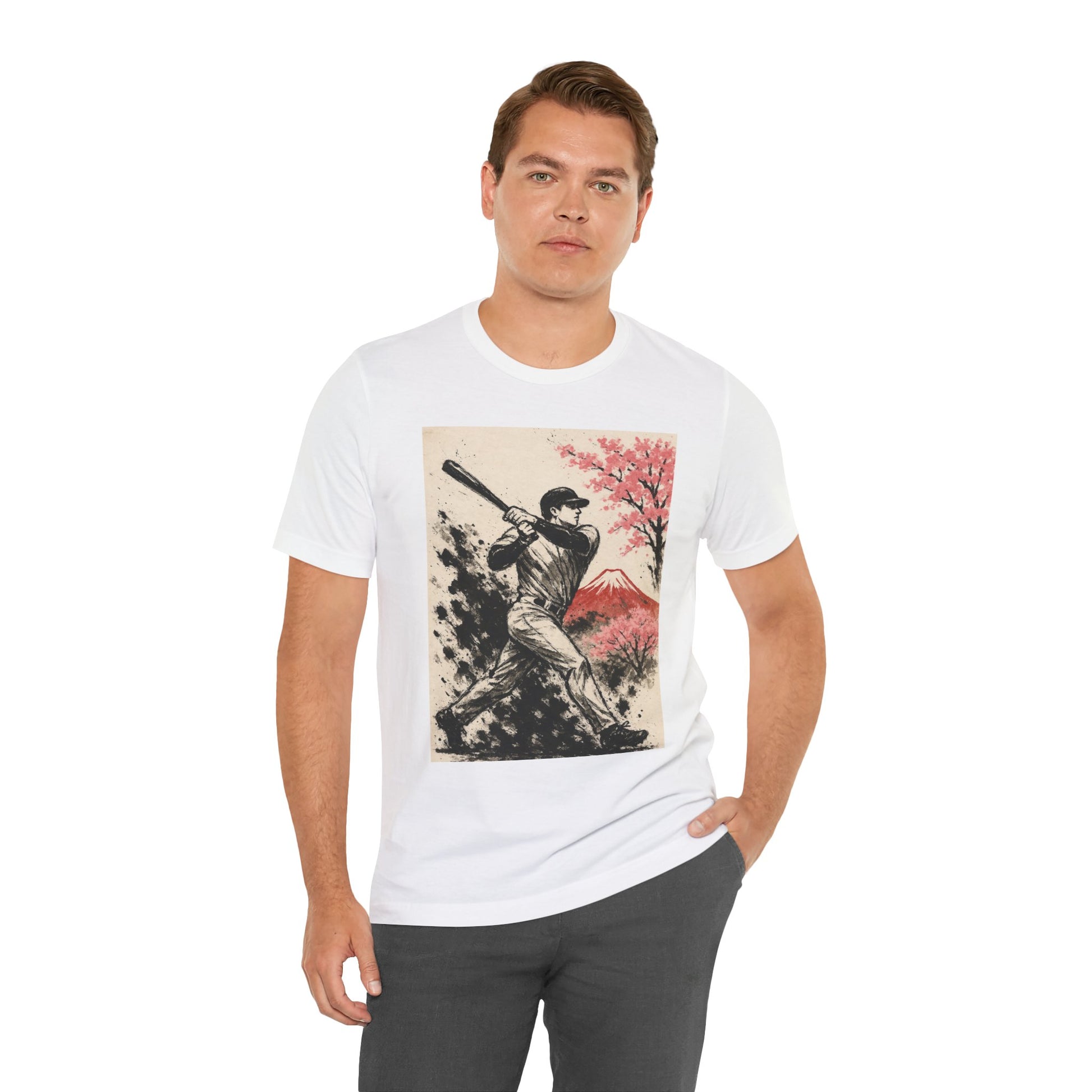 This tee captures a pro batter mid swing in bold sumi ink, with red Fuji and soft cherry blossoms rising behind. The monochrome brush texture turns a game moment into wearable art. It resonates with baseball fans, design minded dads, students, and travelers who love Japan and classic sports illustration.