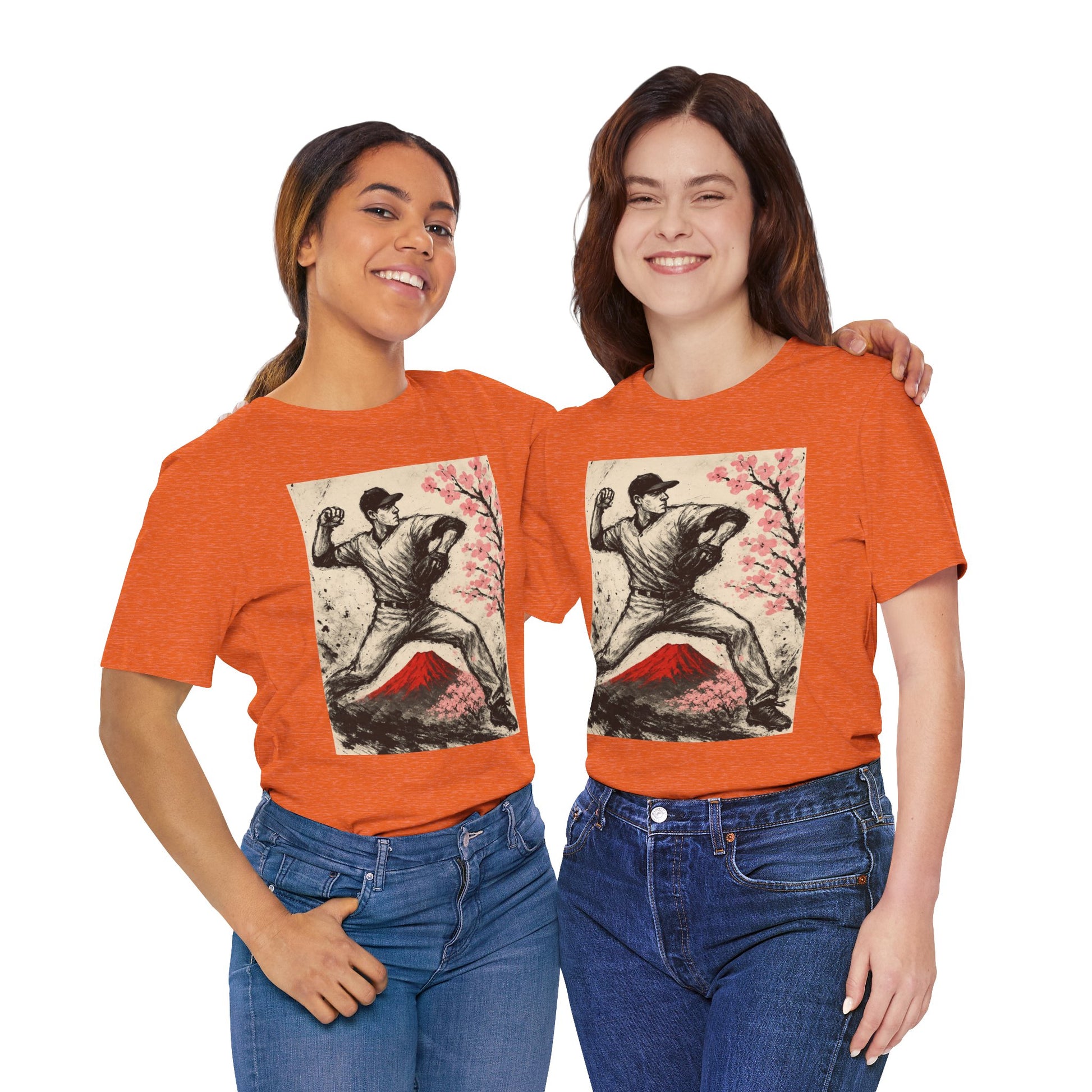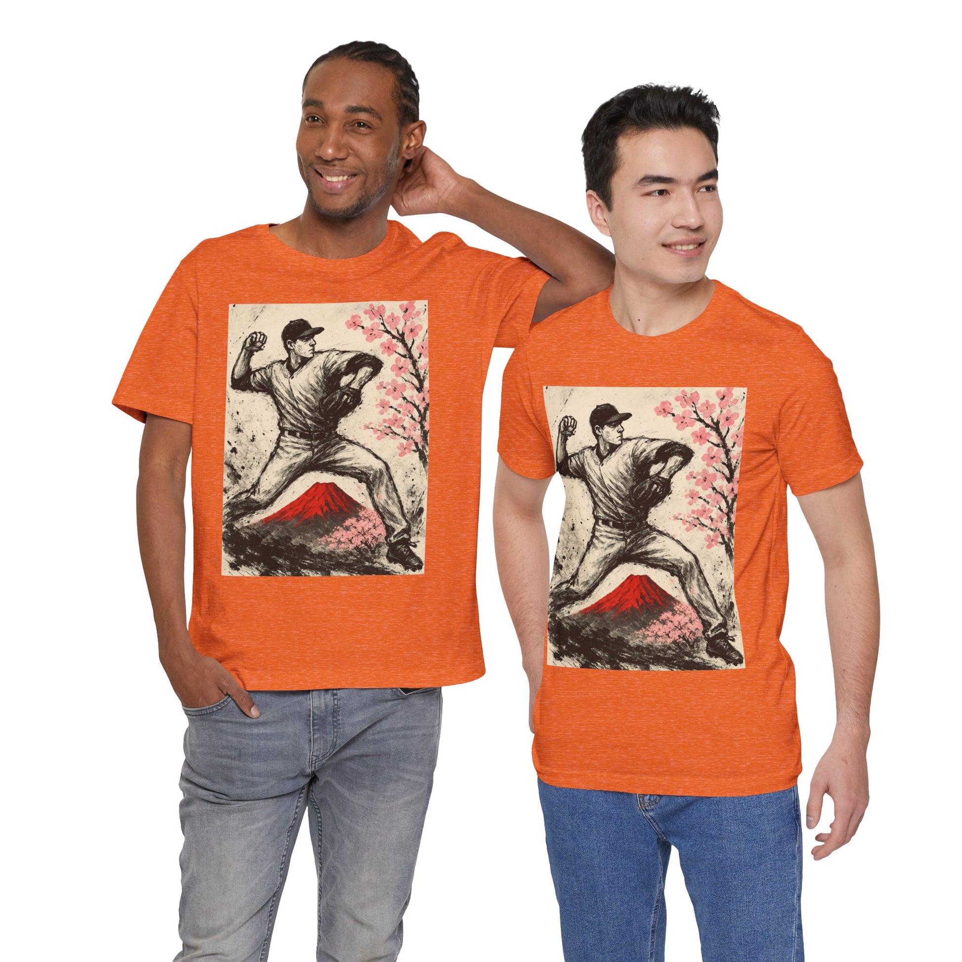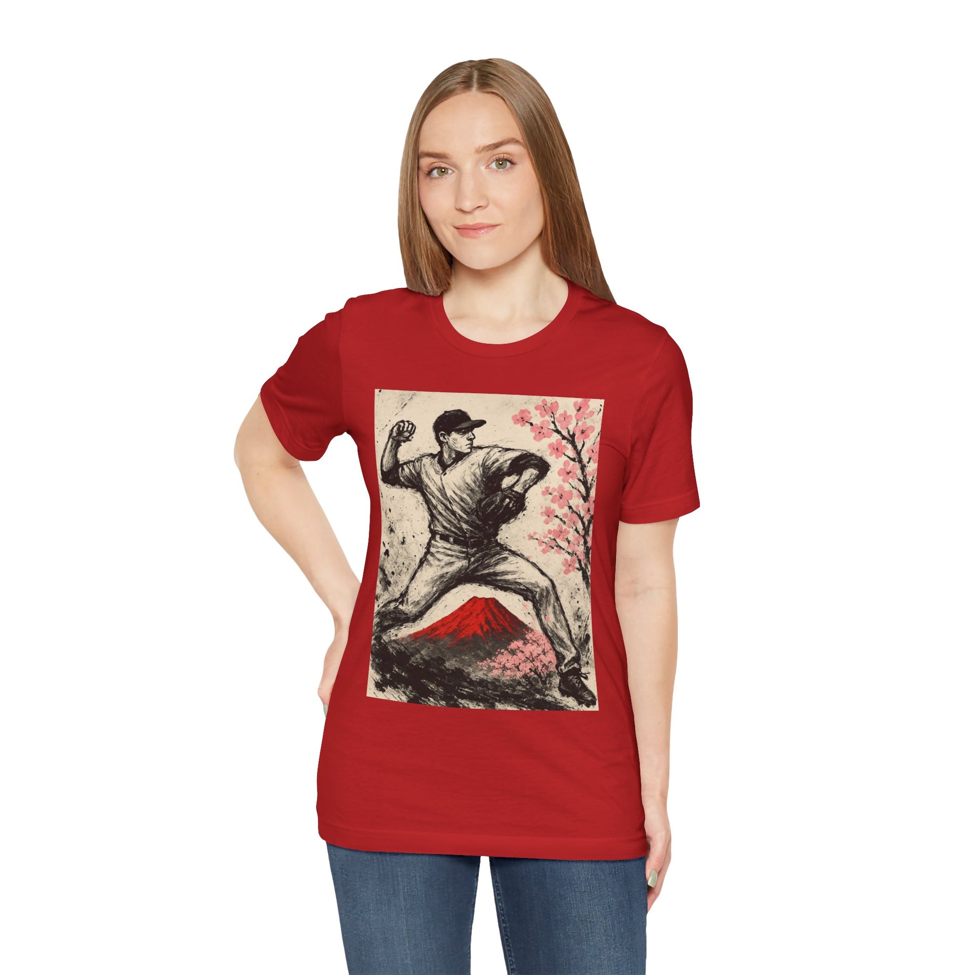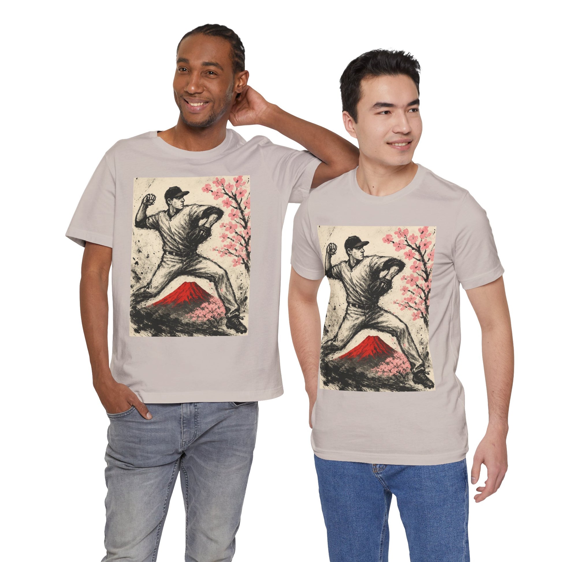 This tee captures a major league style pitcher at peak windup in bold sumi ink, with red Fuji and soft pink cherry blossoms framing the scene. The vintage paper texture turns a game moment into wearable Japanese print art. It resonates with baseball fans, design minded dads, students, and travelers who love Japan and classic sports illustration.