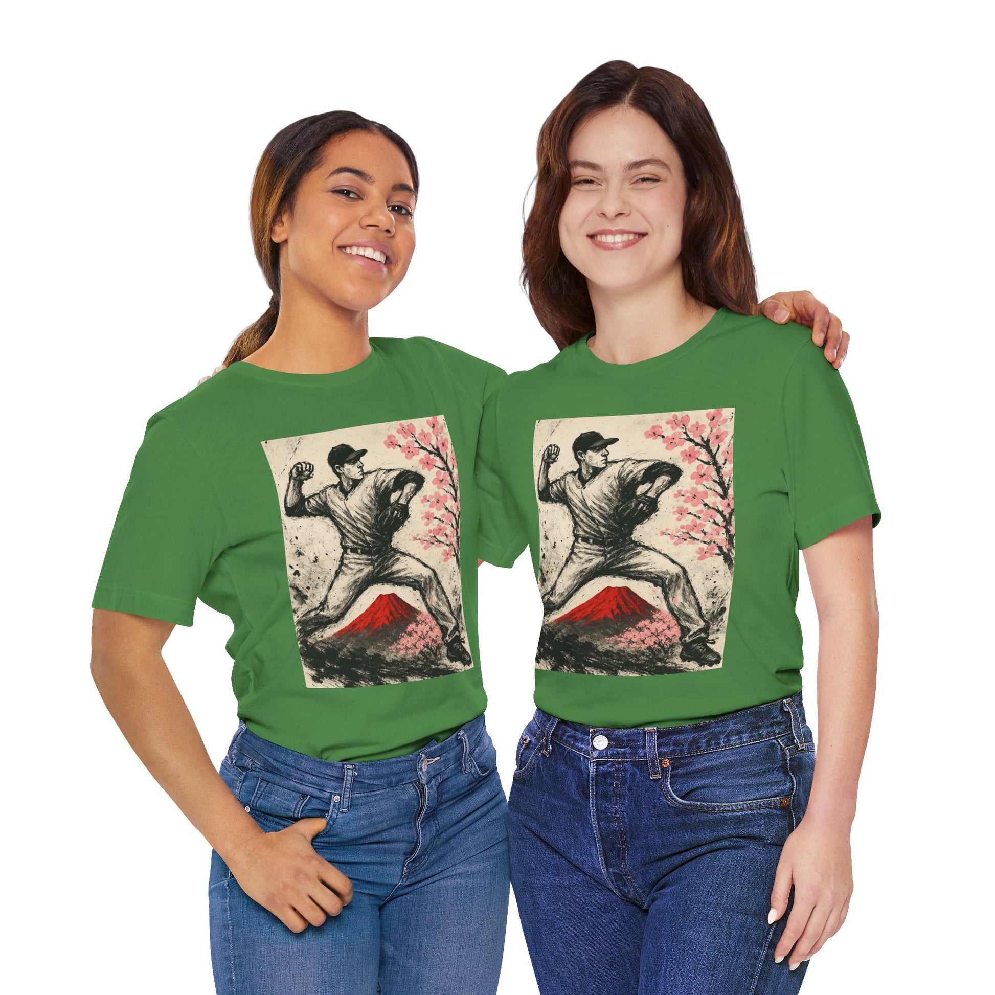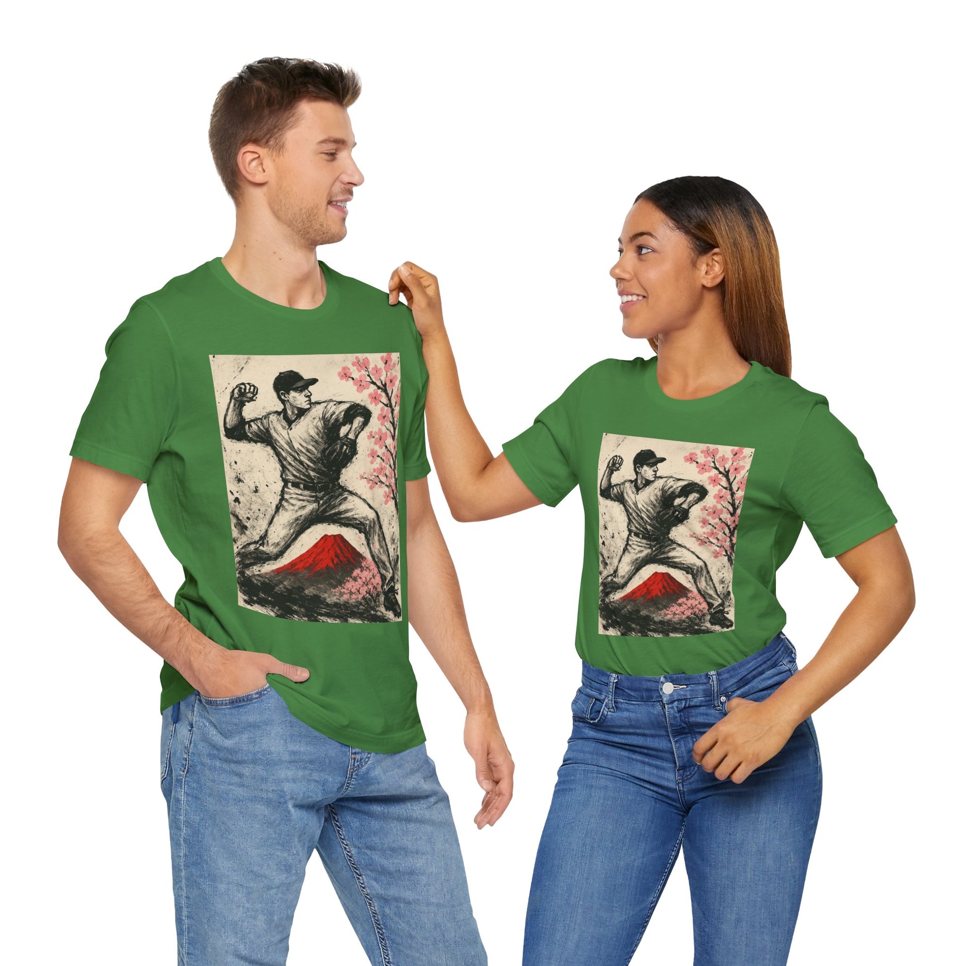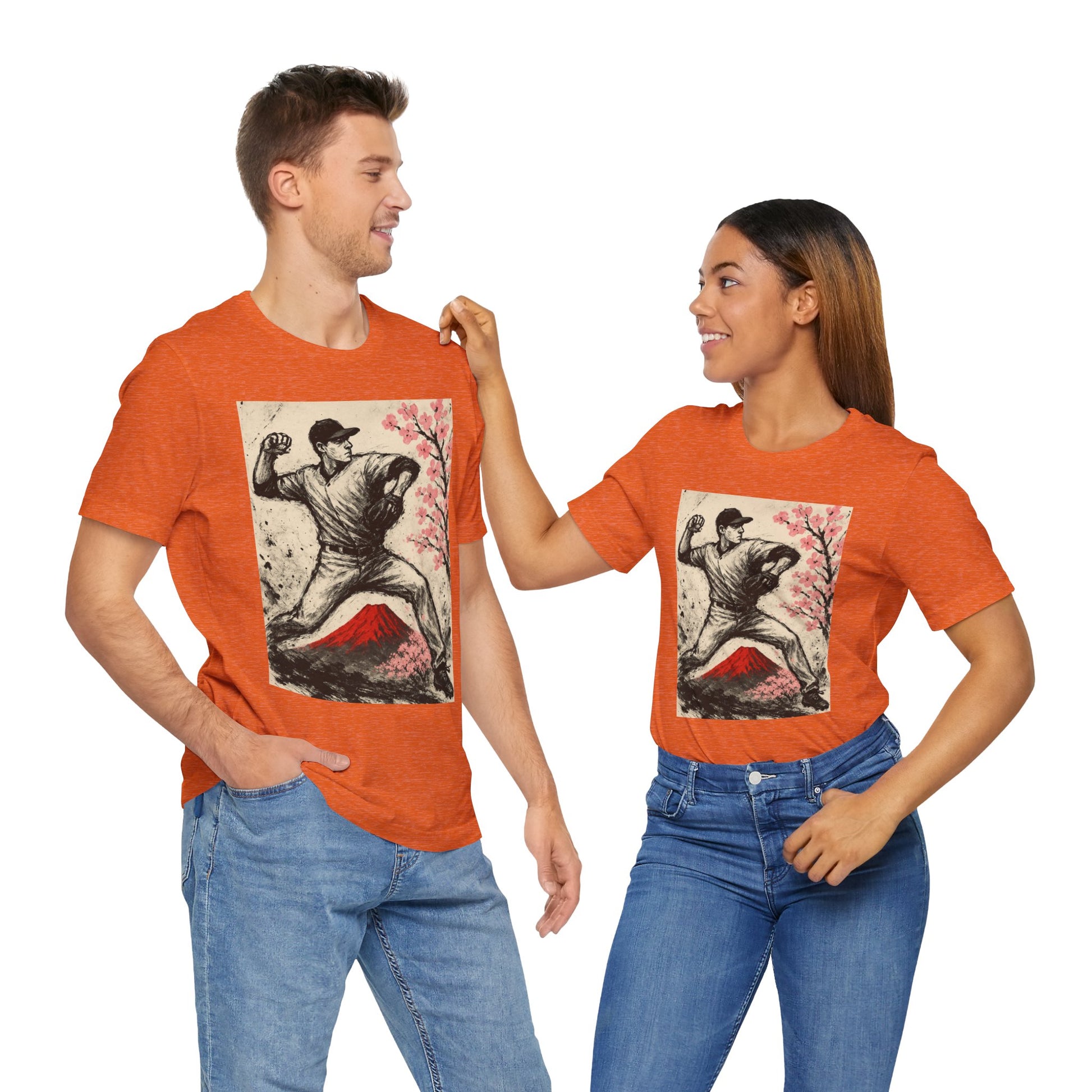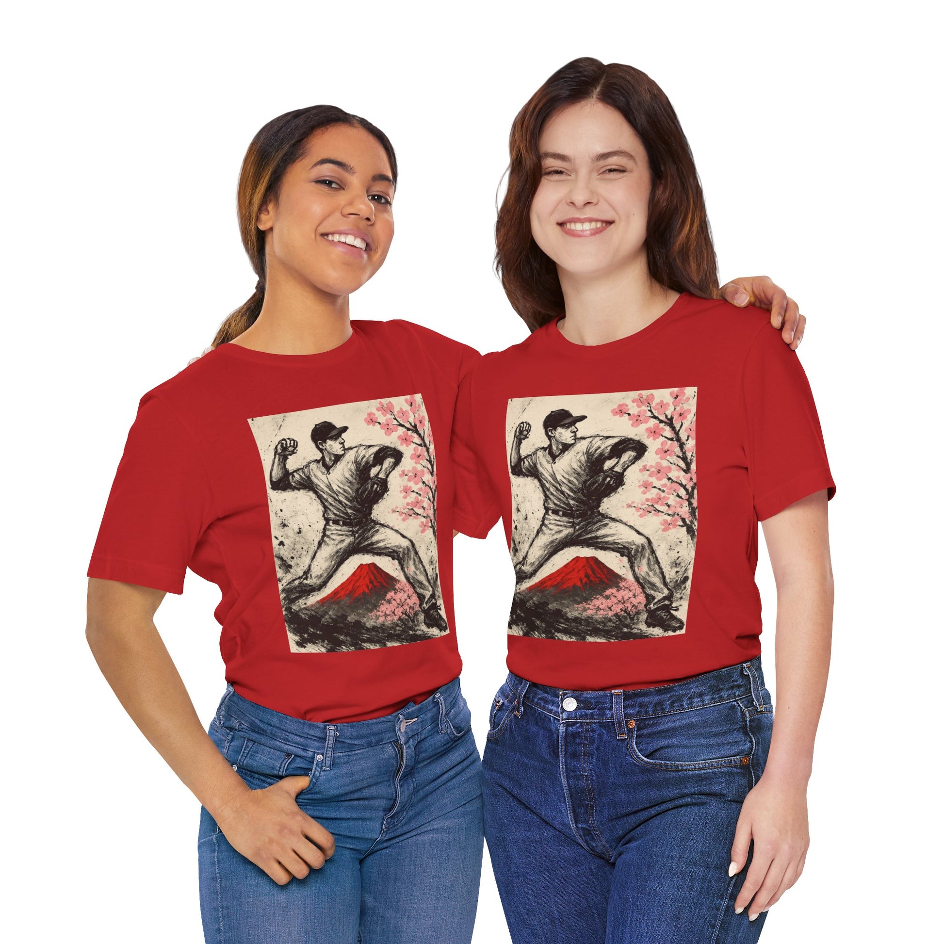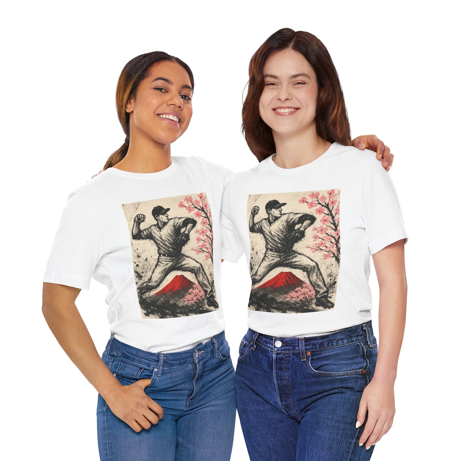 This tee captures a major league style pitcher at peak windup in bold sumi ink, with red Fuji and soft pink cherry blossoms framing the scene. The vintage paper texture turns a game moment into wearable Japanese print art. It resonates with baseball fans, design minded dads, students, and travelers who love Japan and classic sports illustration.