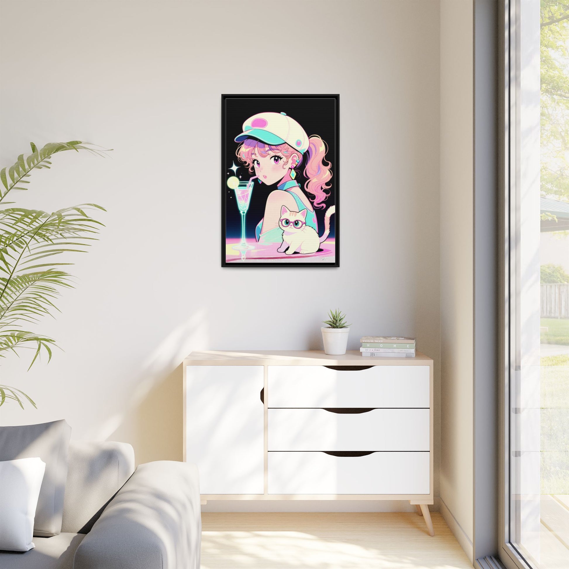 A pastel neon girl sips through a straw while a glasses wearing cat sits at her side. Printed on gallery grade canvas this piece blends vaporwave color and shoujo elegance so your space looks like a frame from a dreamy city night.