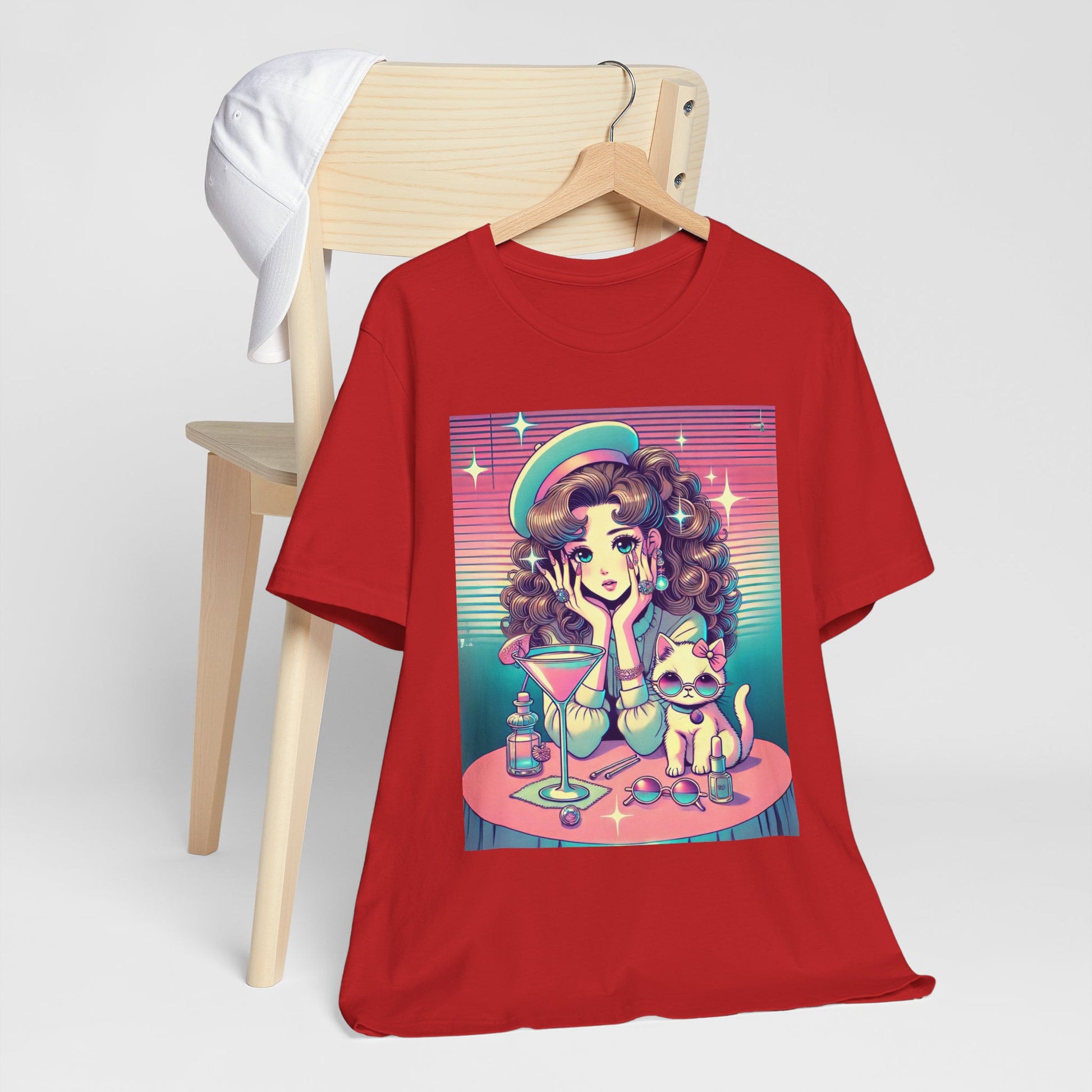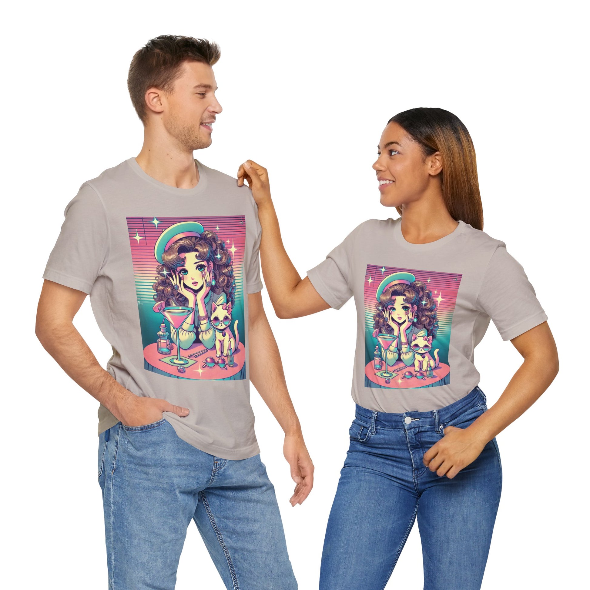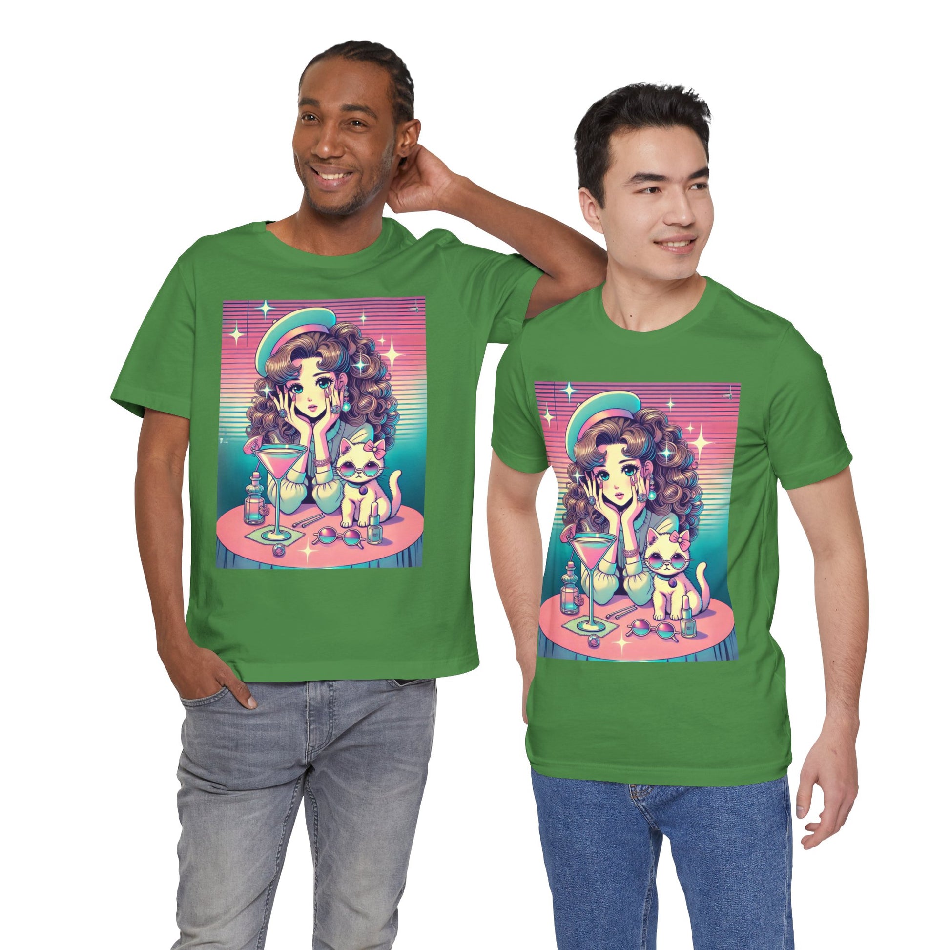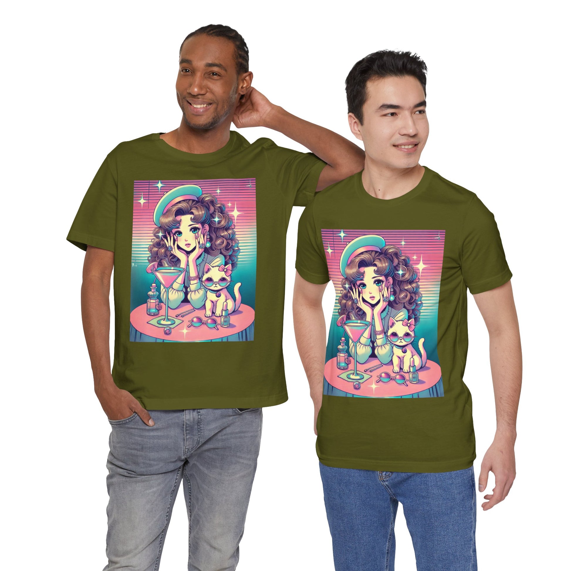 Retro Girl and Cat Graphic Tee Vaporwave Pastel Aesthetic Cocktail Lounge 80s Inspired Shoujo Style T Shirt Gift for Daughter or Dad