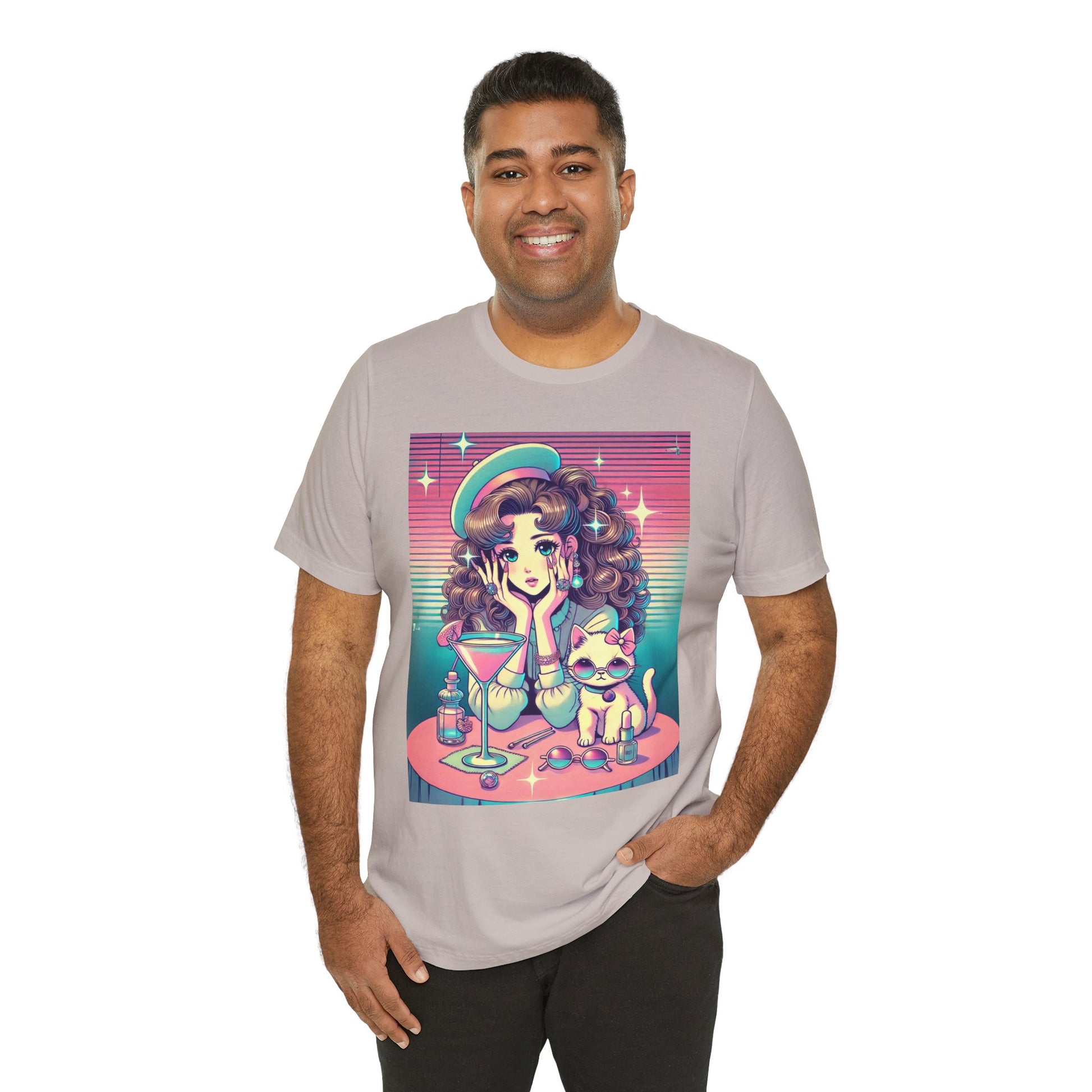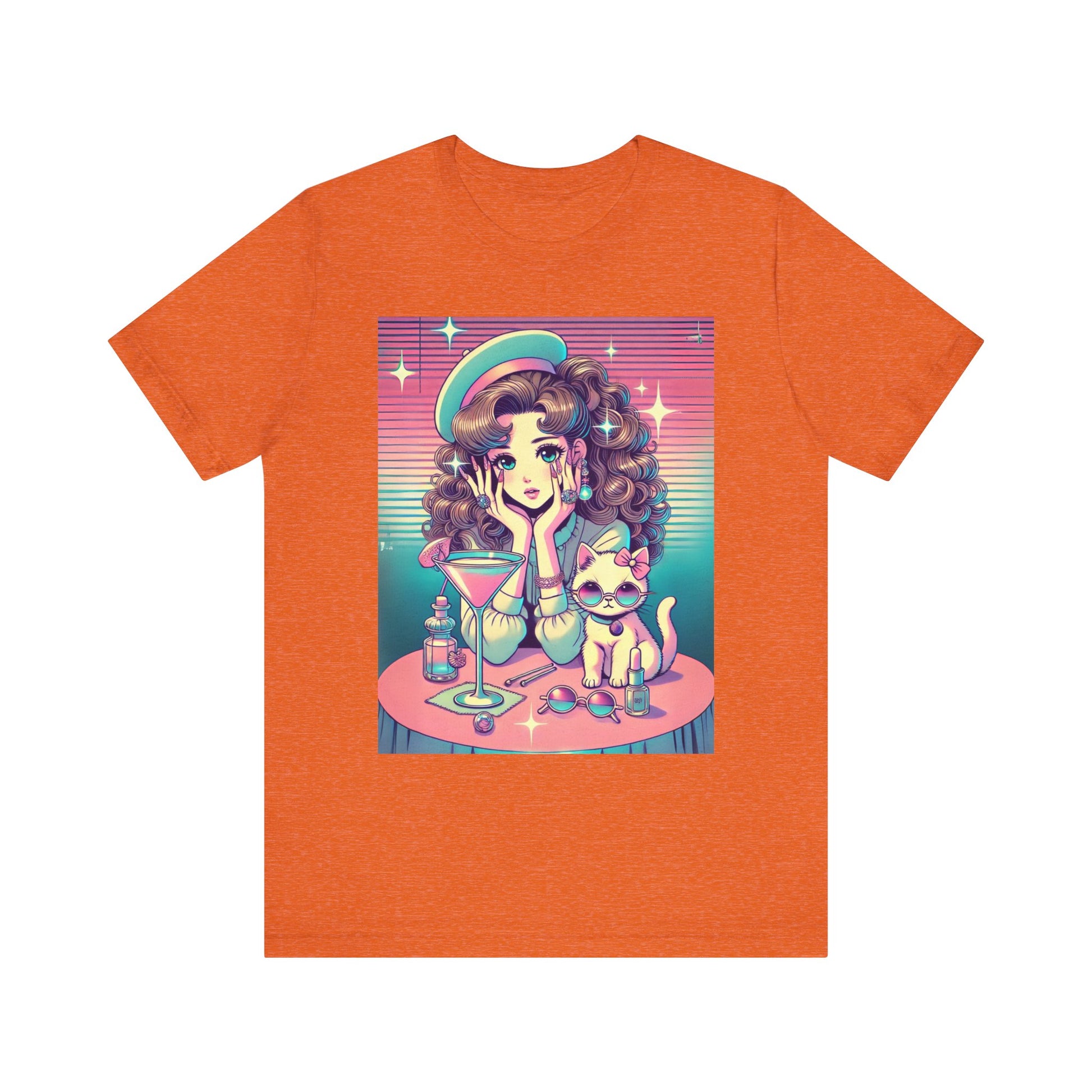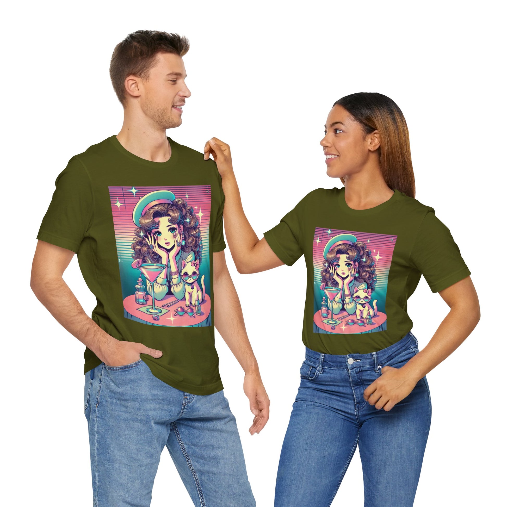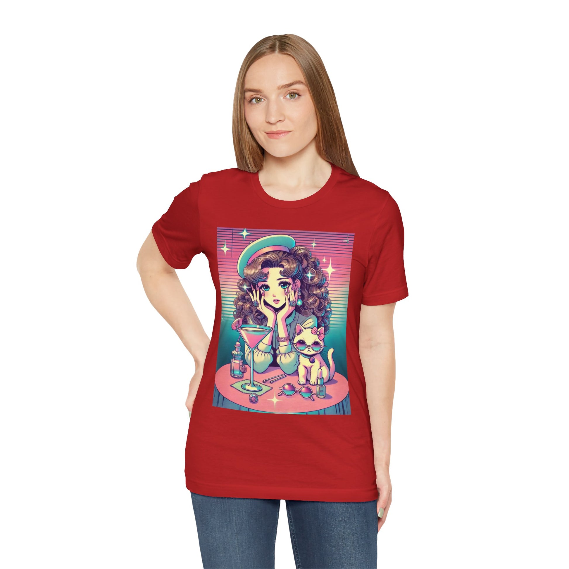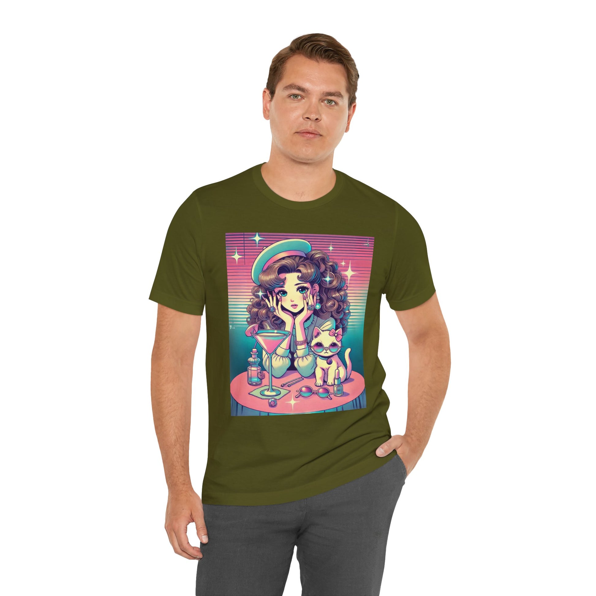 Retro Girl and Cat Graphic Tee Vaporwave Pastel Aesthetic Cocktail Lounge 80s Inspired Shoujo Style T Shirt Gift for Daughter or Dad