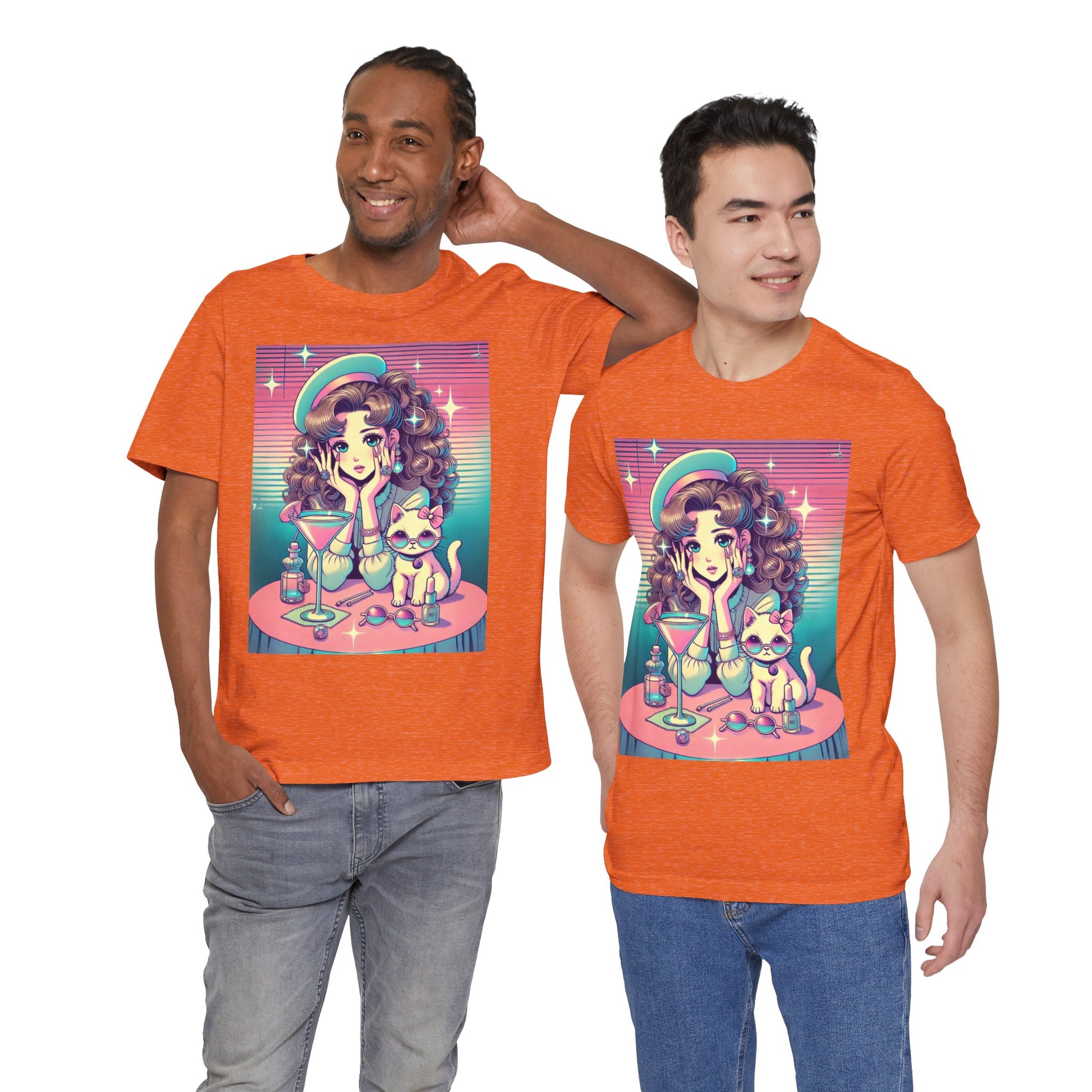 A retro girl and her bow wearing cat sit at a cocktail table glinting with rings perfume and stars. This graphic brings shoujo style elegance and vaporwave color to a soft everyday tee so your outfit looks like a frame from a dreamy night out.