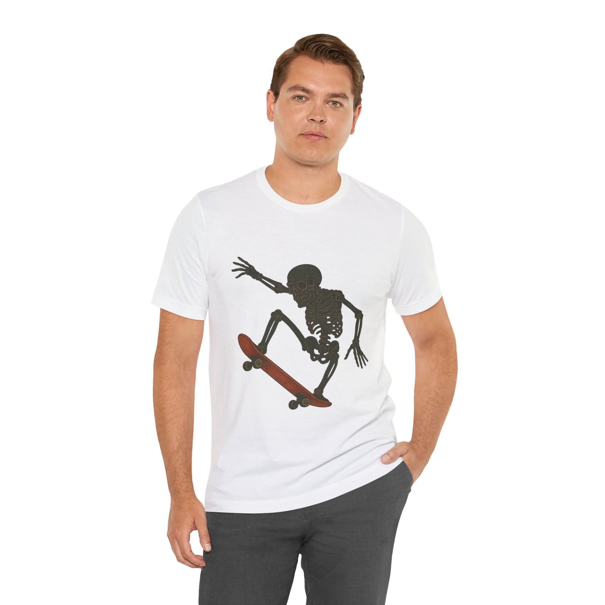 Stand out from the crowd with this bold and artistic Skater Skeleton T-Shirt. Featuring a unique, vintage-inspired illustration of a skeleton mid-air on a skateboard, this tee fuses street culture, rebellious energy, and artistic flair. Whether you're into skating, bold fashion, or simply love graphic tees with an edge, this shirt has attitude. Available in multiple skeleton and skateboard color combinations, each design offers a distinct vibe—from burnt red to bone beige to deep black. Printed on soft, durable fabric, it’s the perfect blend of comfort and statement-making style. 🎯 Perfect For: Skaters who want to show off their individuality Art lovers who appreciate alternative vintage aesthetics Adults looking for unique streetwear Gifts for graphic tee collectors, Halloween fans, or edgy friends 🎁 Ideal Gift for birthdays, skatepark hangouts, concerts, or casual weekend wear.