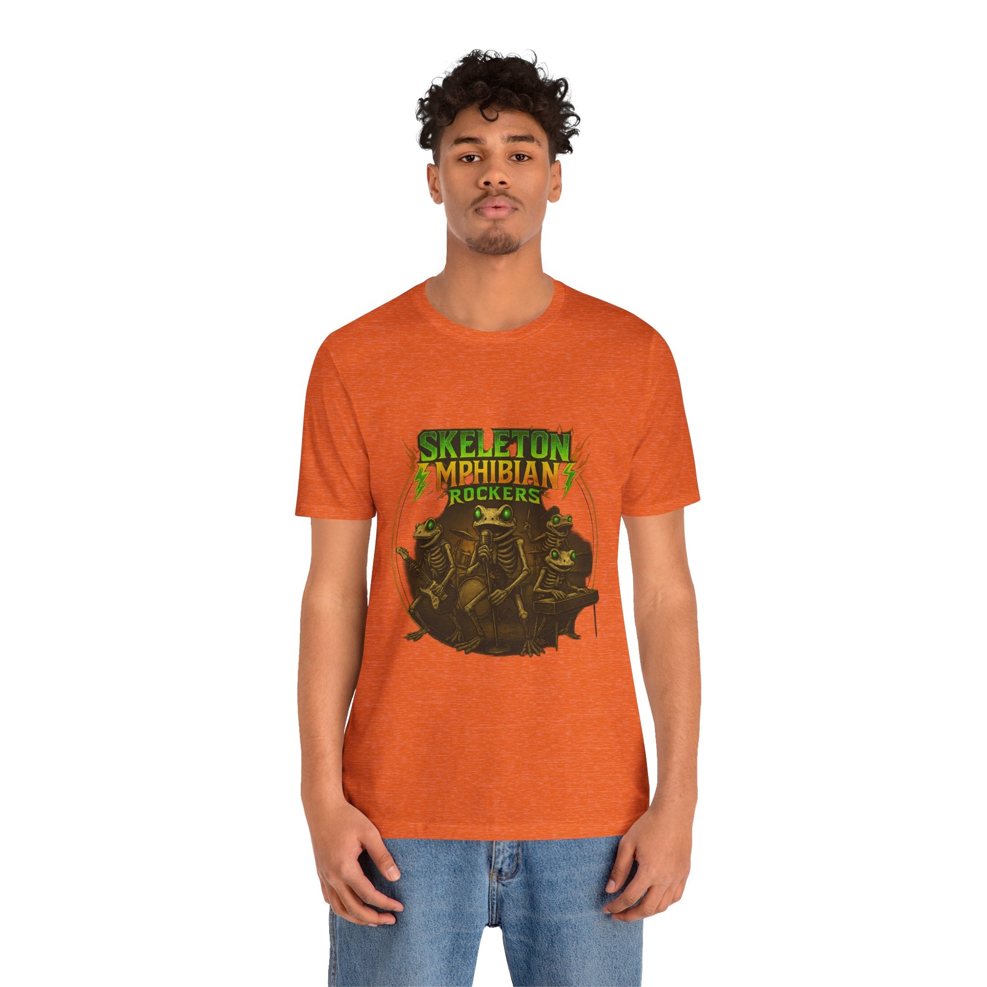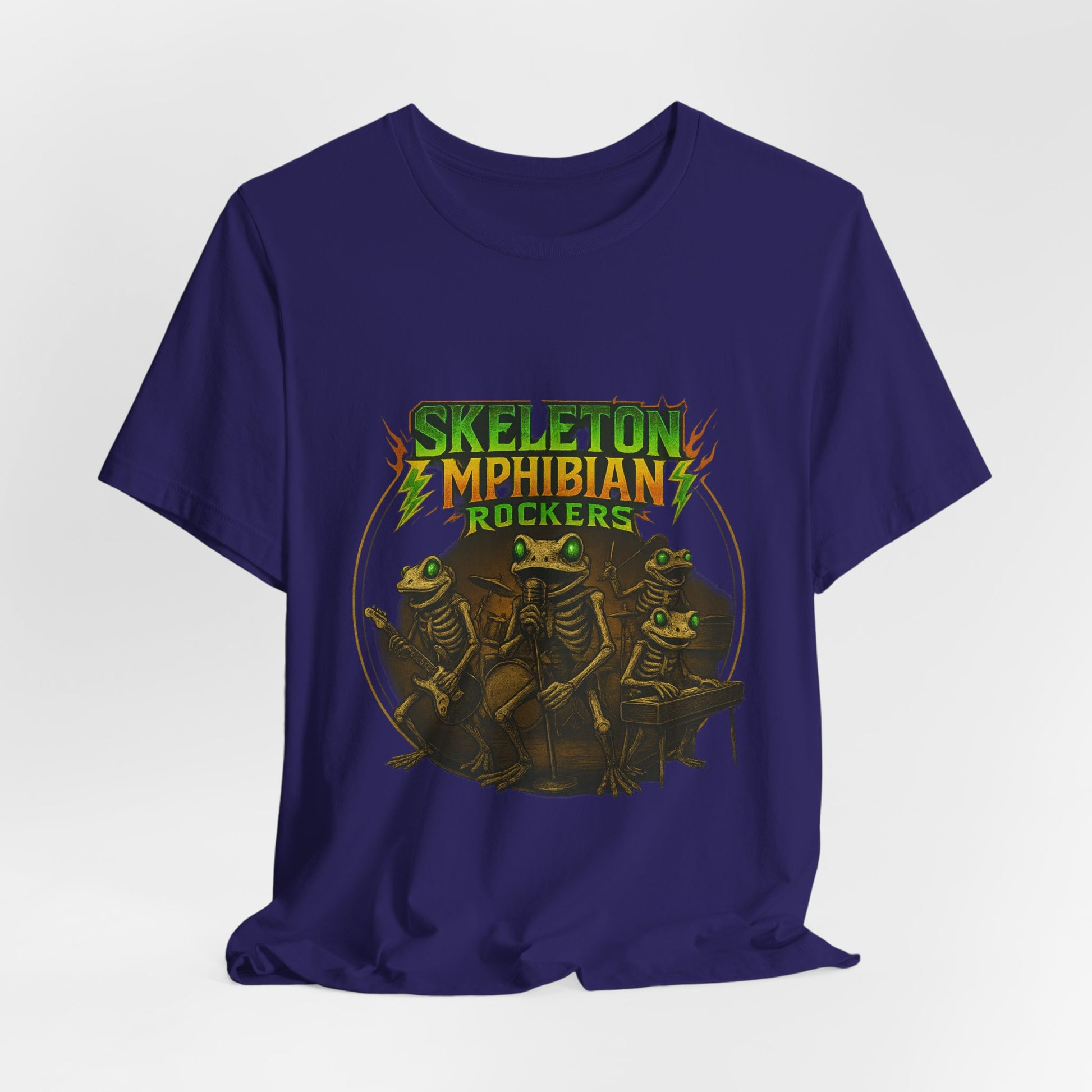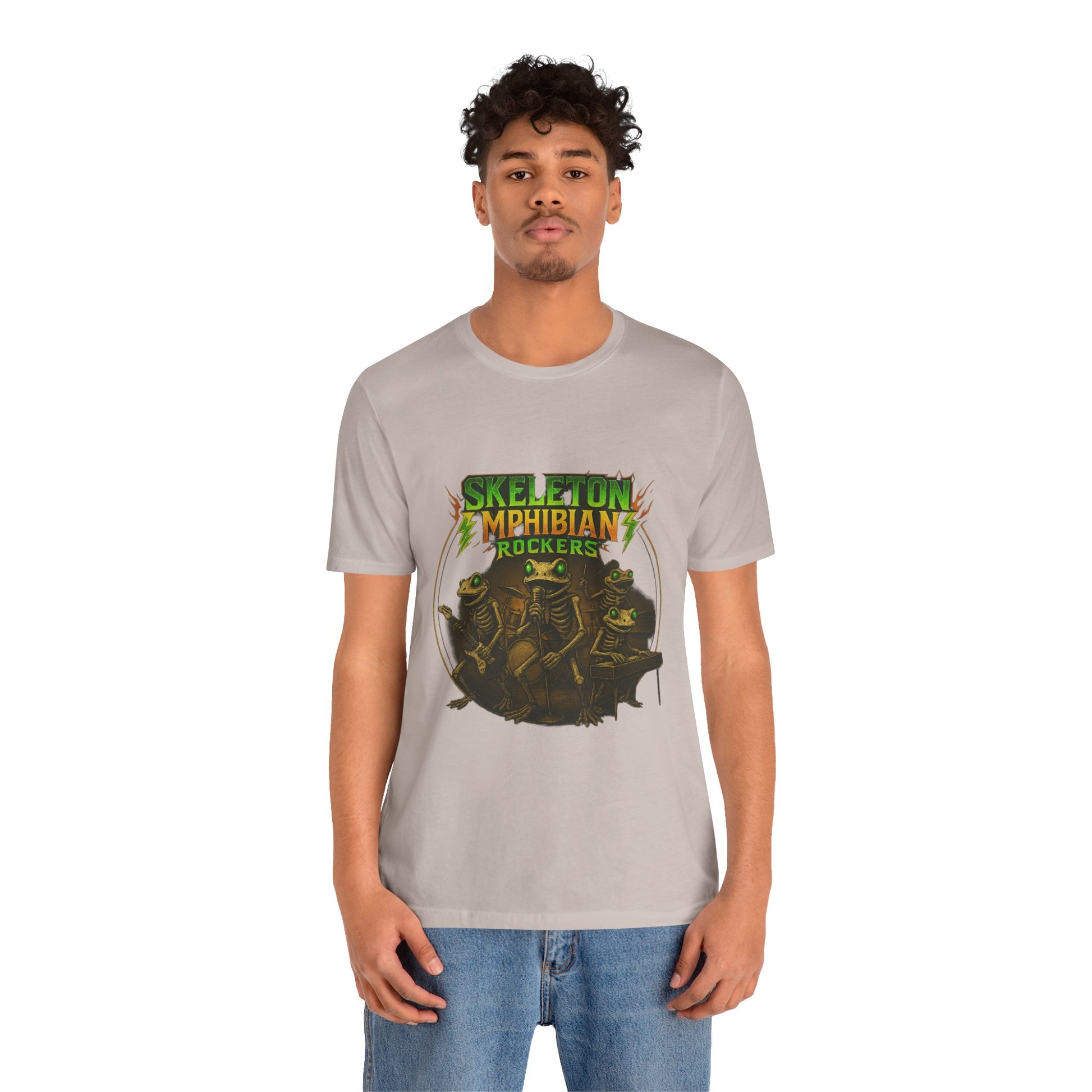 Skeleton Amphibian Rockers Album Cover Tee - Green Eyed Skeleton Frog Band Vocal Guitar Piano Drums Rock Art Shirt