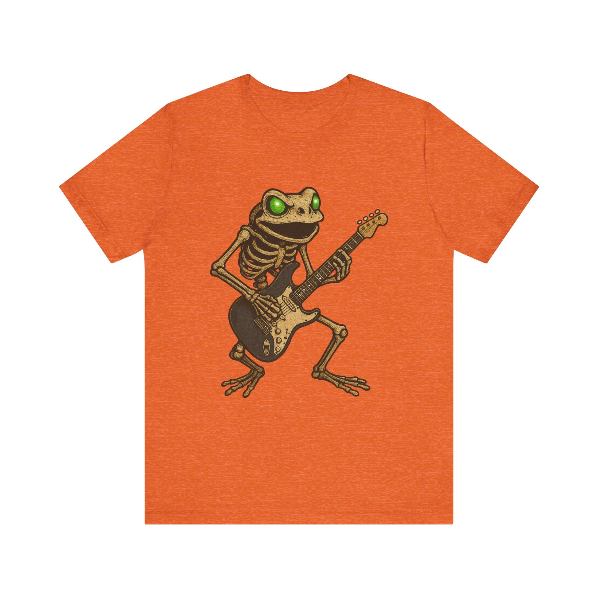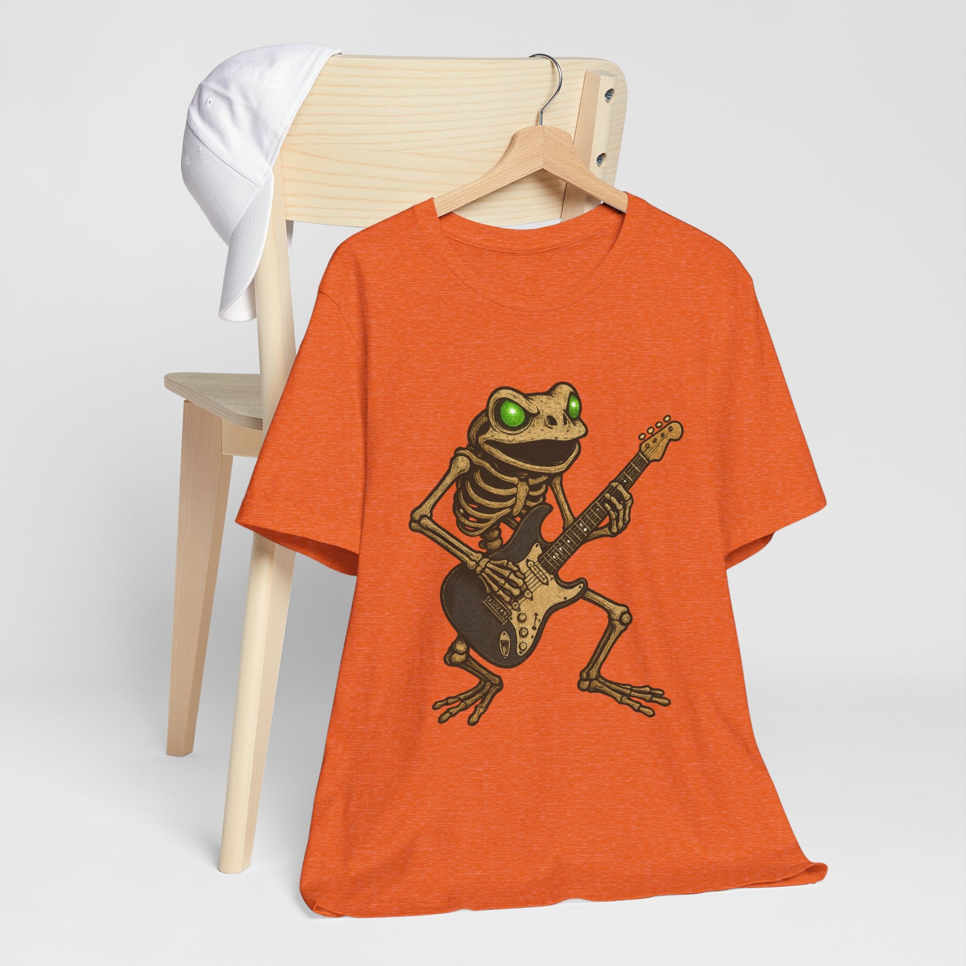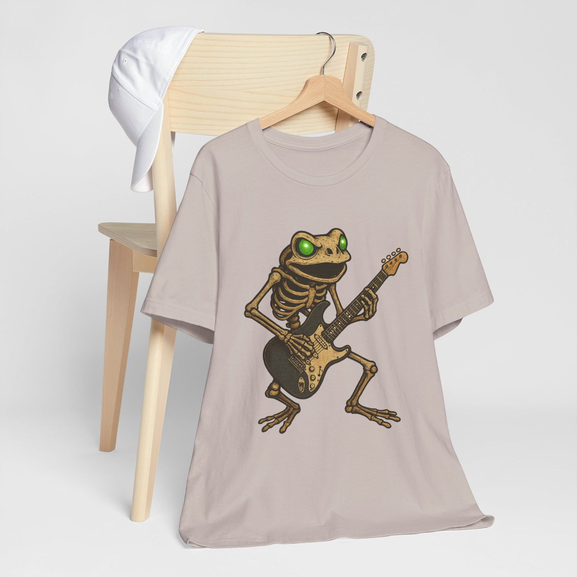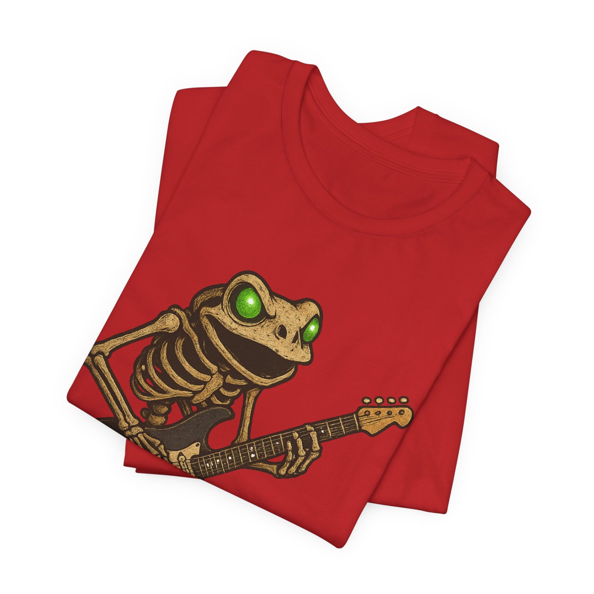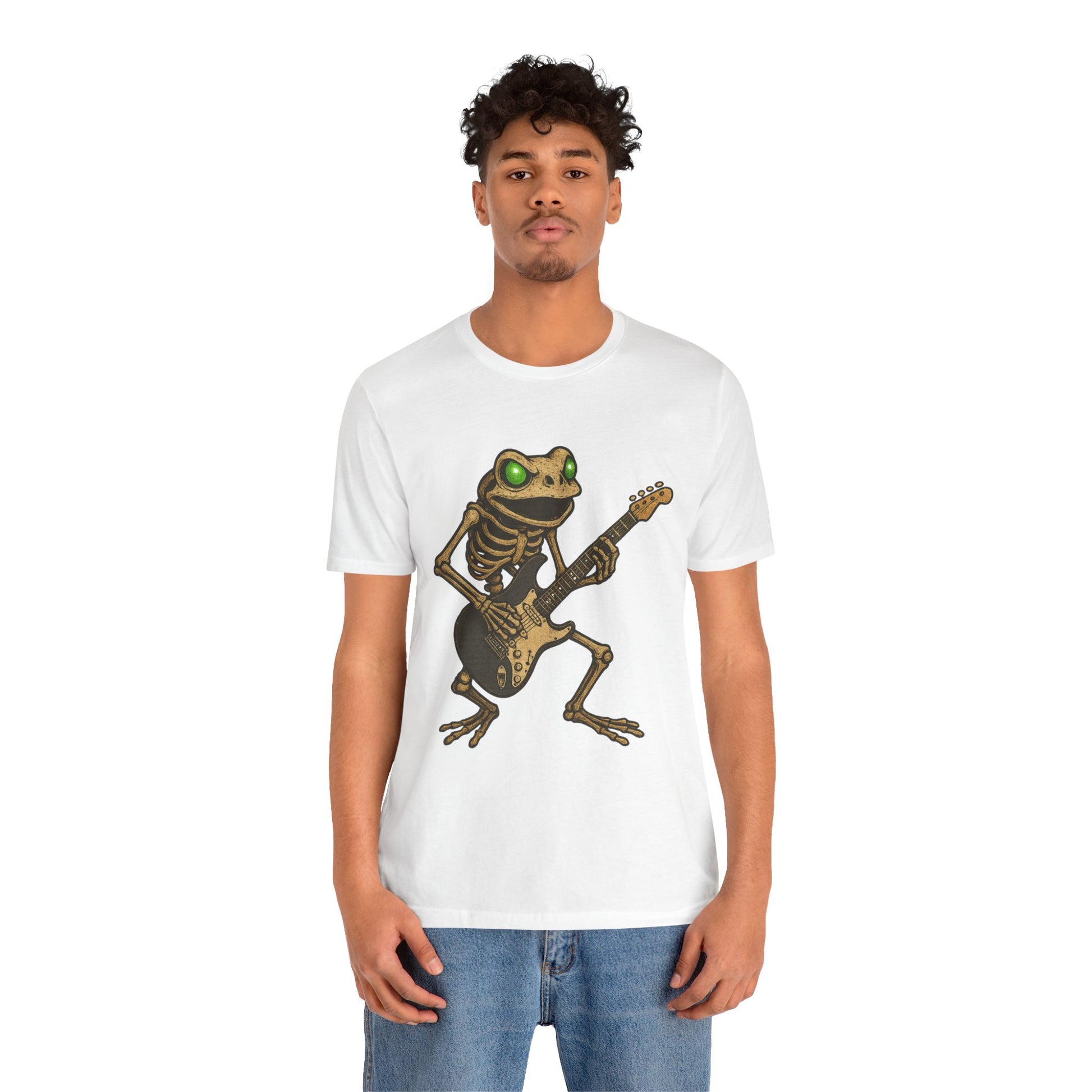 Skeleton Frog Shredding Electric Guitar Tee - Glowing Green Eyes Rock Art Shirt for Musicians Frog Lovers and Gothic Punk Style