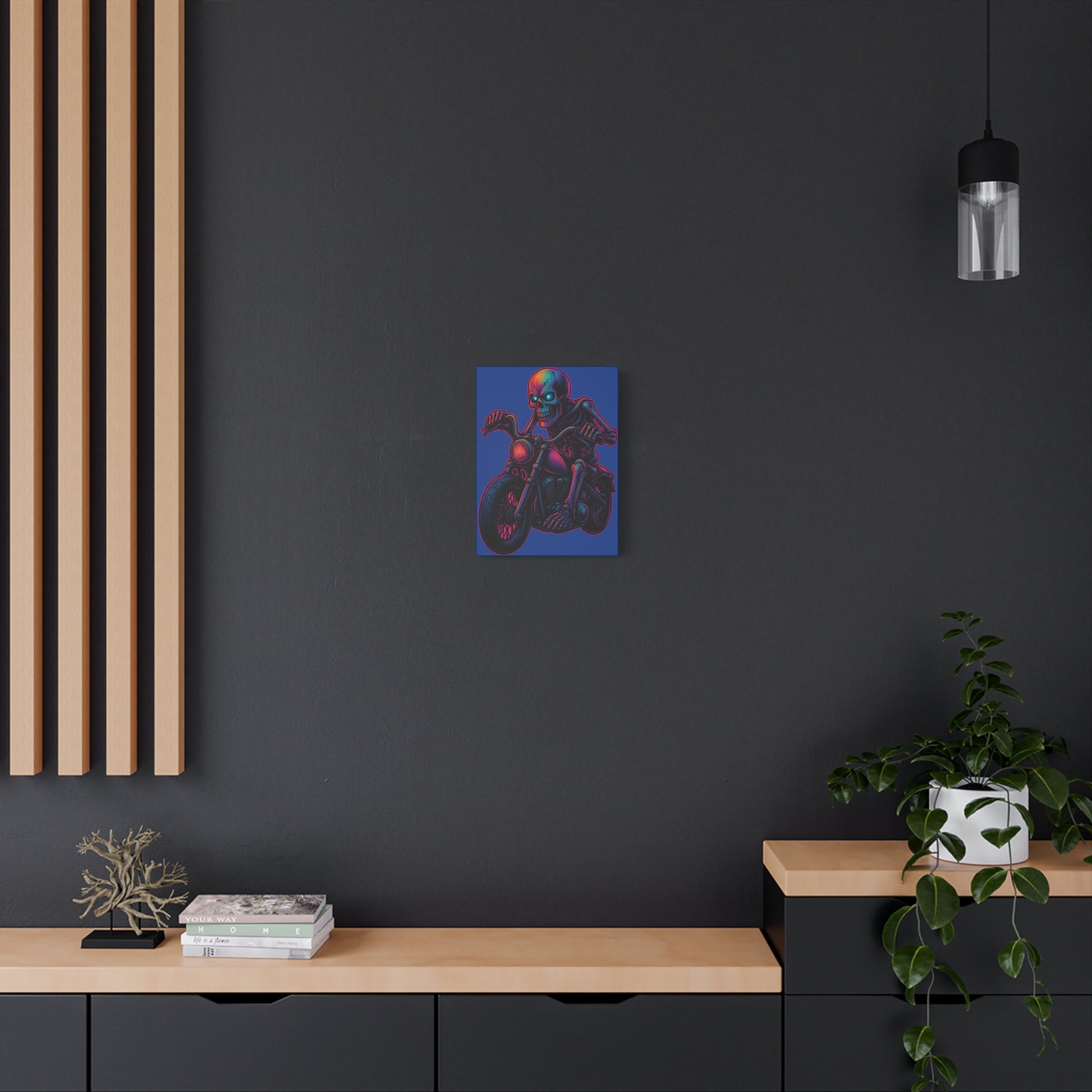 This canvas features a glowing skull rider on a V twin chopper rendered in saturated neon shades for an electric garage poster vibe. The high contrast lines and retro poster texture make it read from across the room and photograph beautifully for gifting and reviews. It connects with motorcycle enthusiasts, skull art collectors, design minded dads, and anyone building a statement gallery wall.