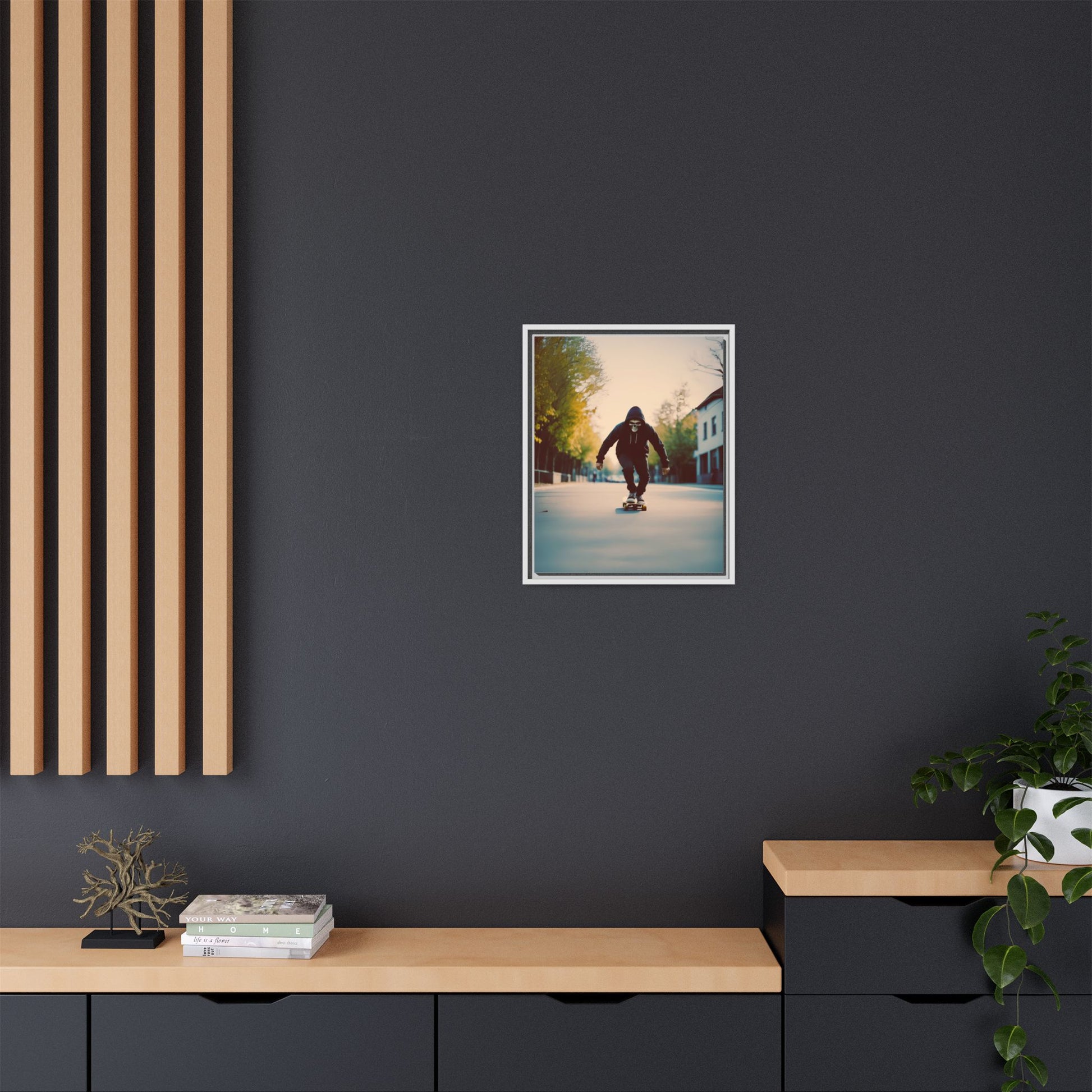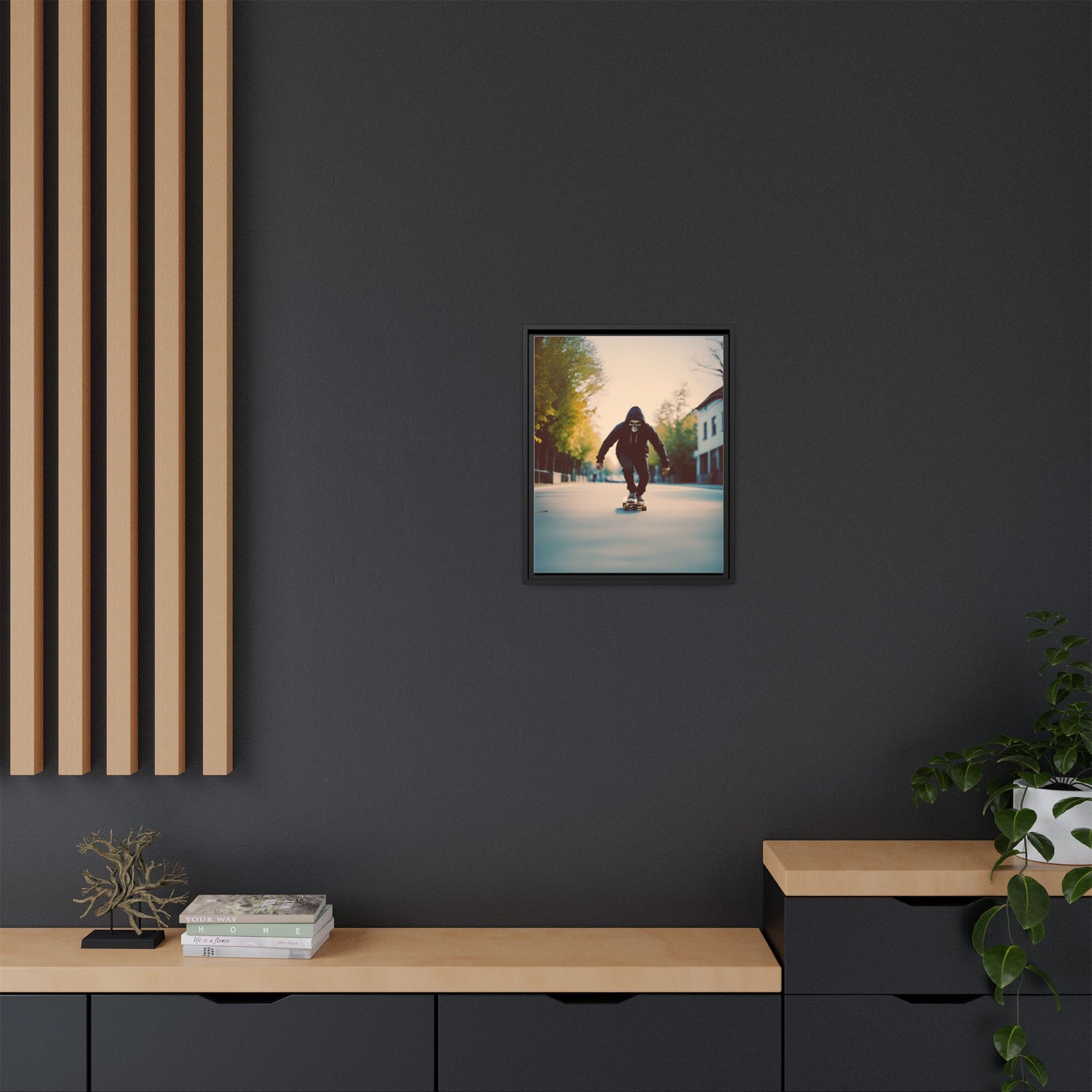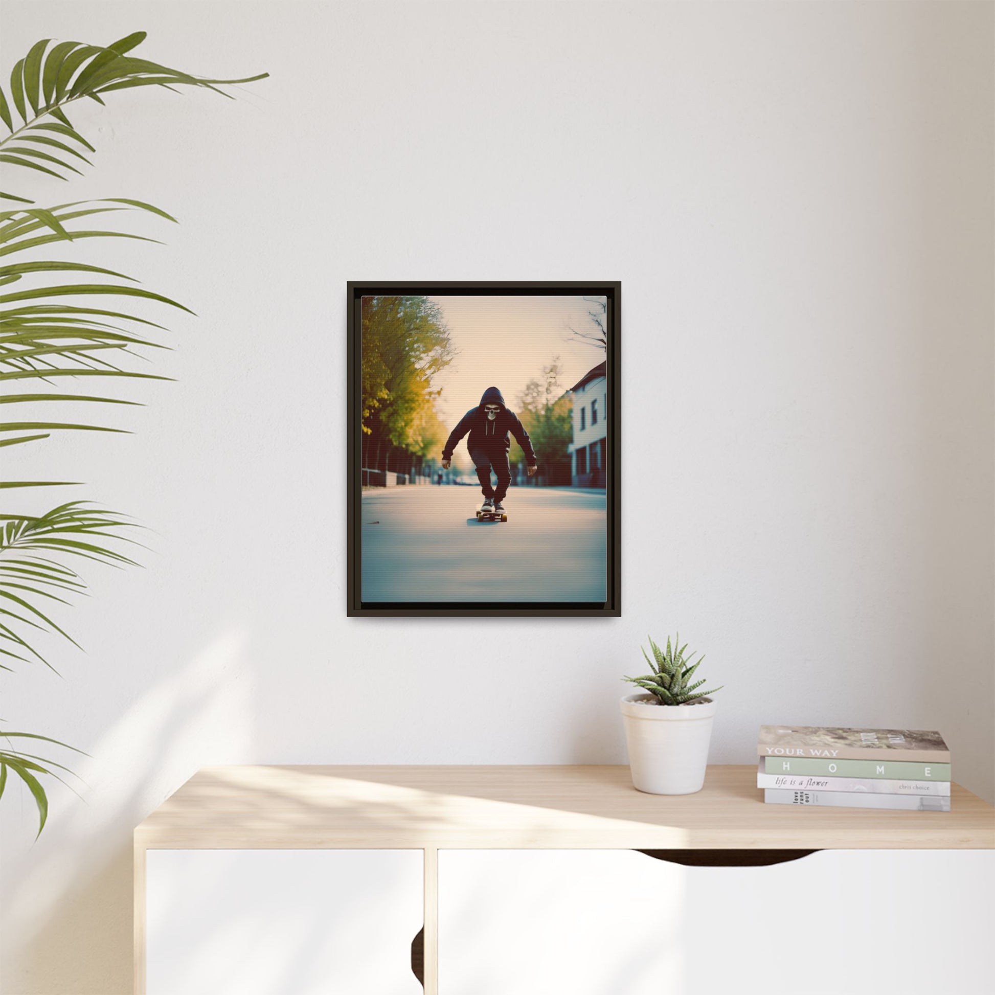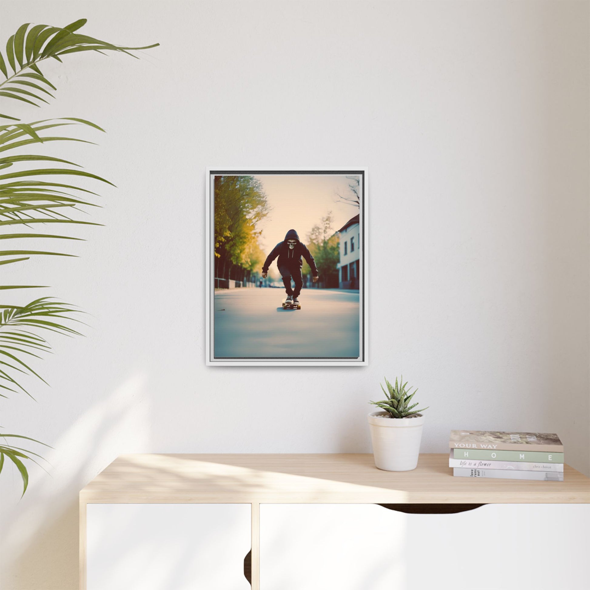 This canvas captures a hooded skater in a skull mask cruising an empty city road at dawn. The cinematic depth and soft highlights turn an urban moment into gallery ready wall decor. It resonates with skull art fans skateboarders horror lovers and design minded dads who want a statement piece that feels fast yet minimal.