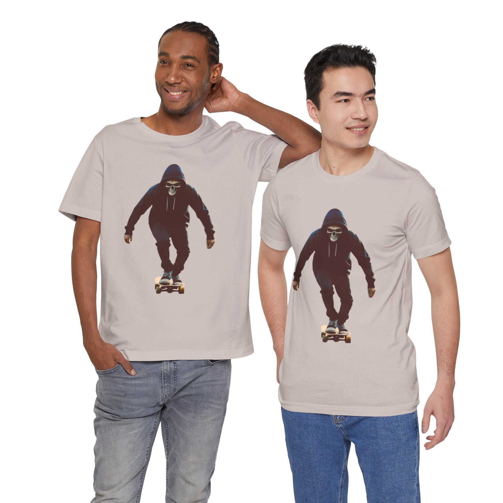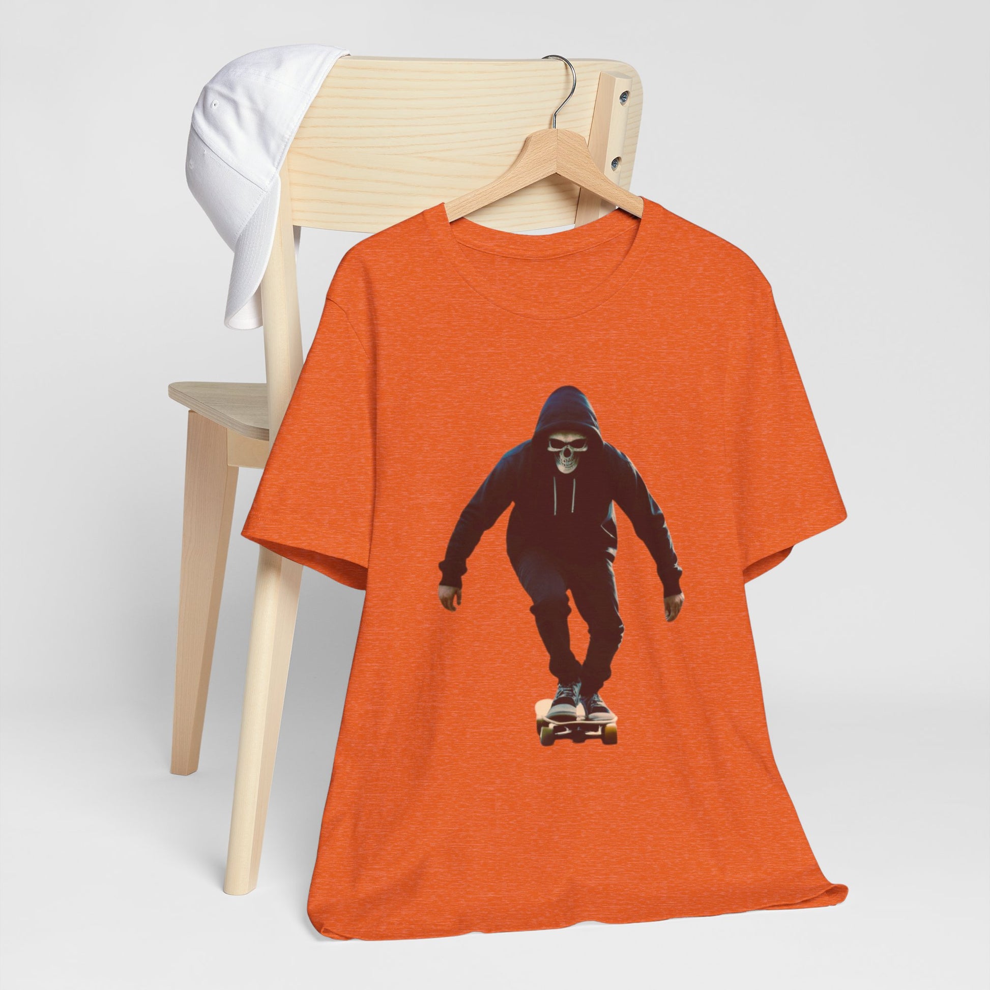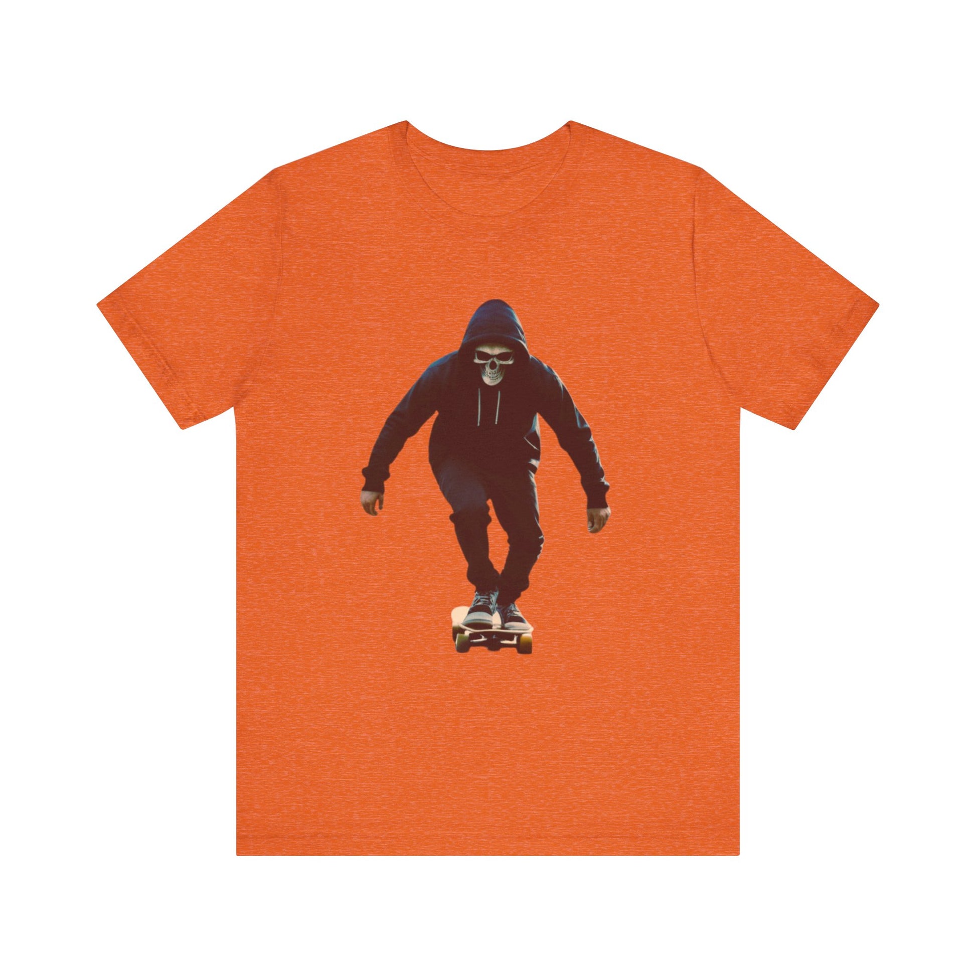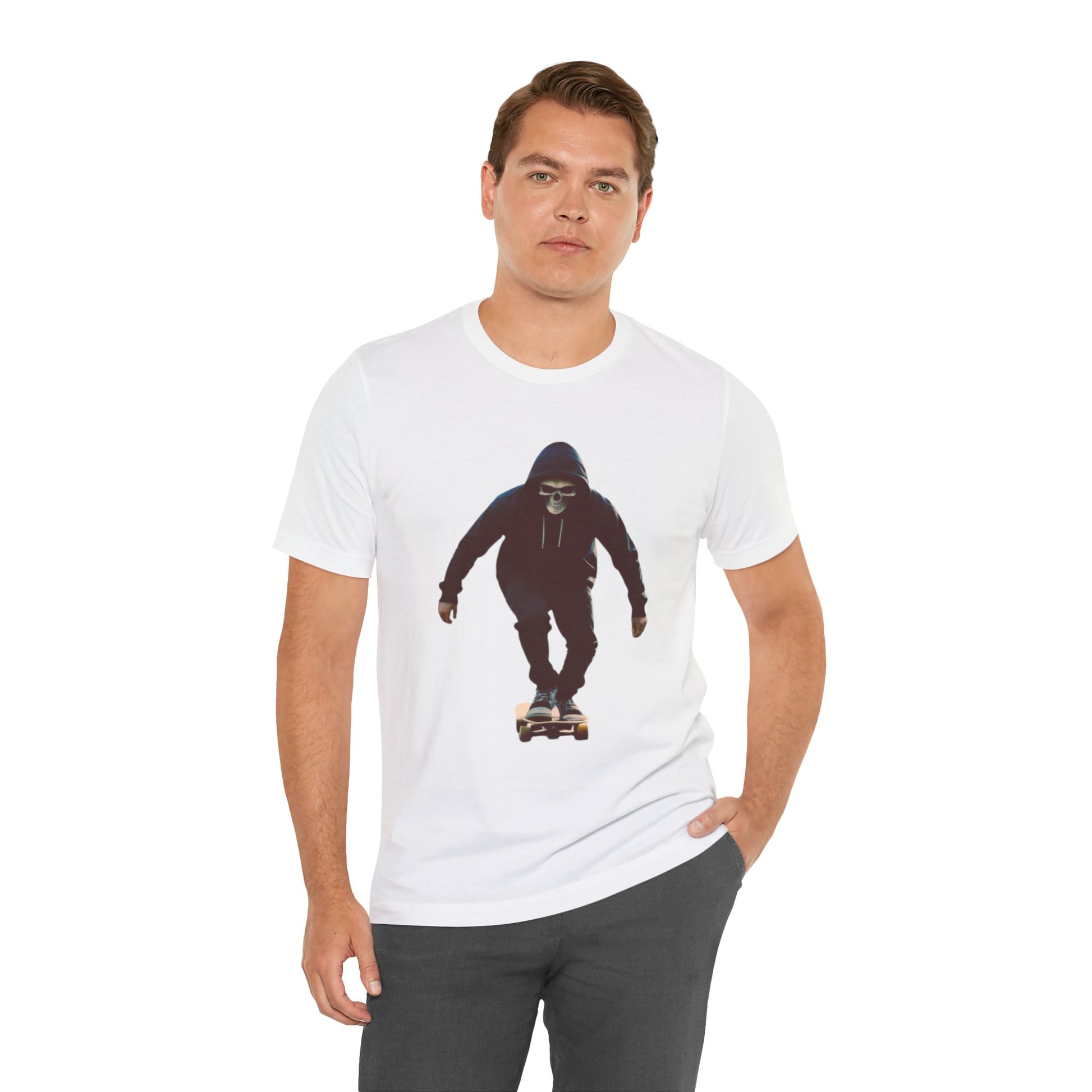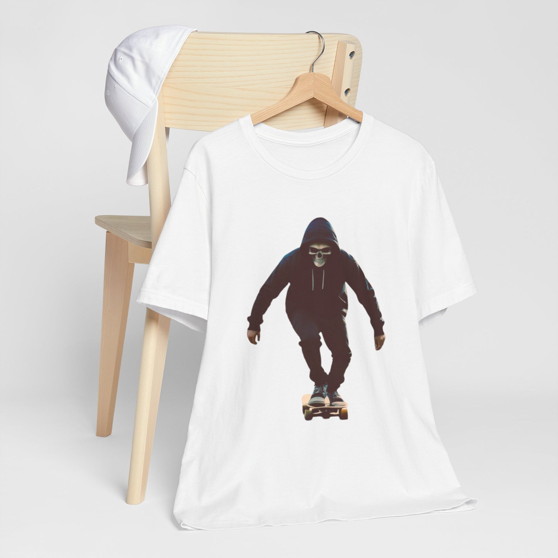 This T shirt brings that cinematic moment onto soft breathable cotton. A hooded skater in a skull mask glides through an empty city street, captured in bold graphic detail. The design combines gothic edge with skate culture energy, perfect for those who want more than just a shirt—they want a story on fabric.