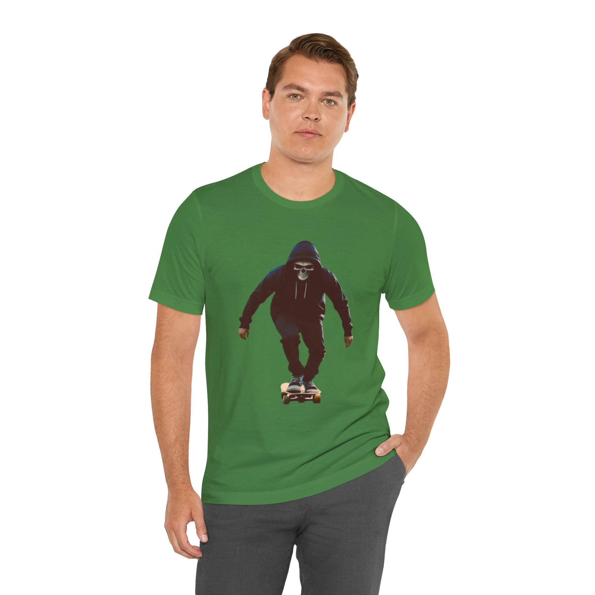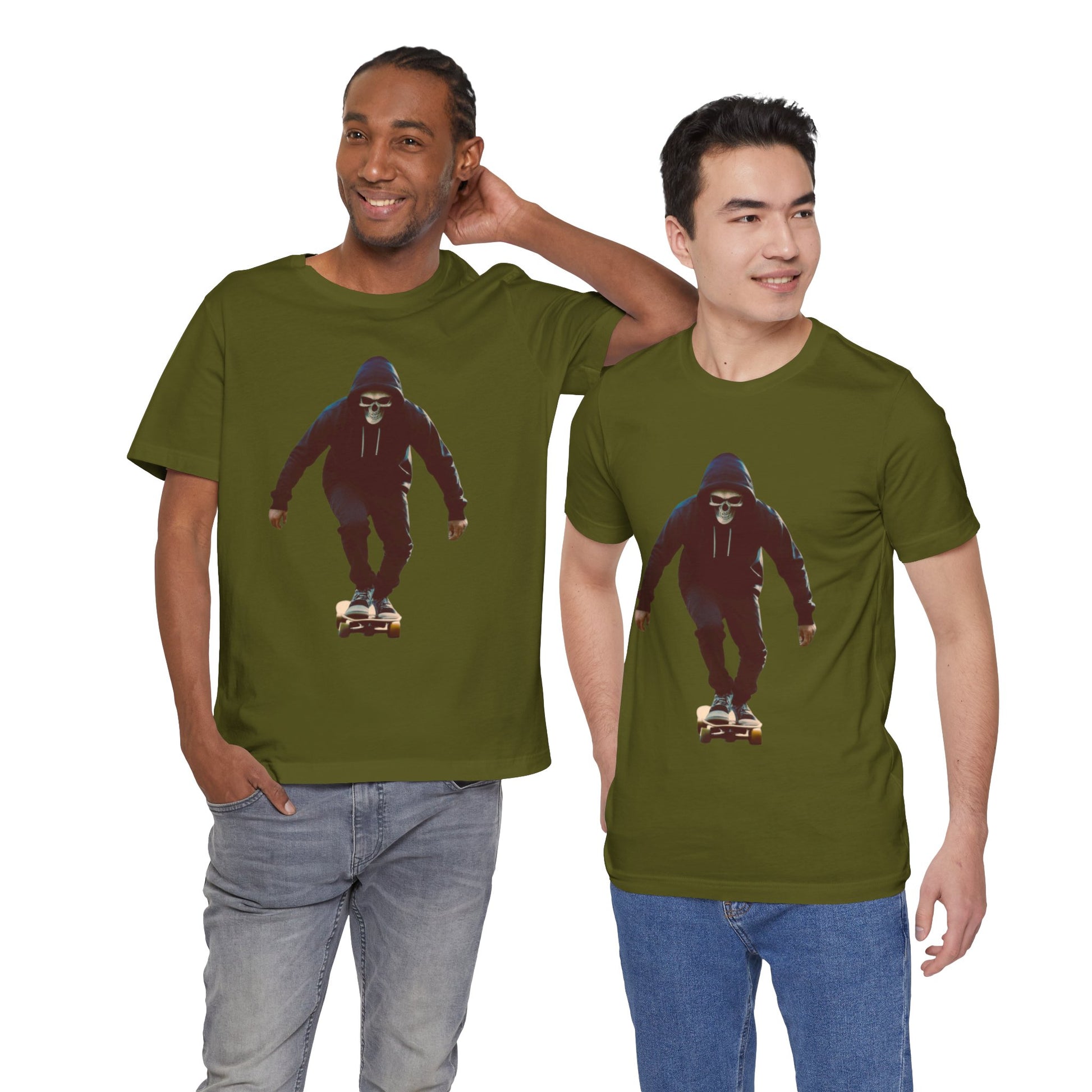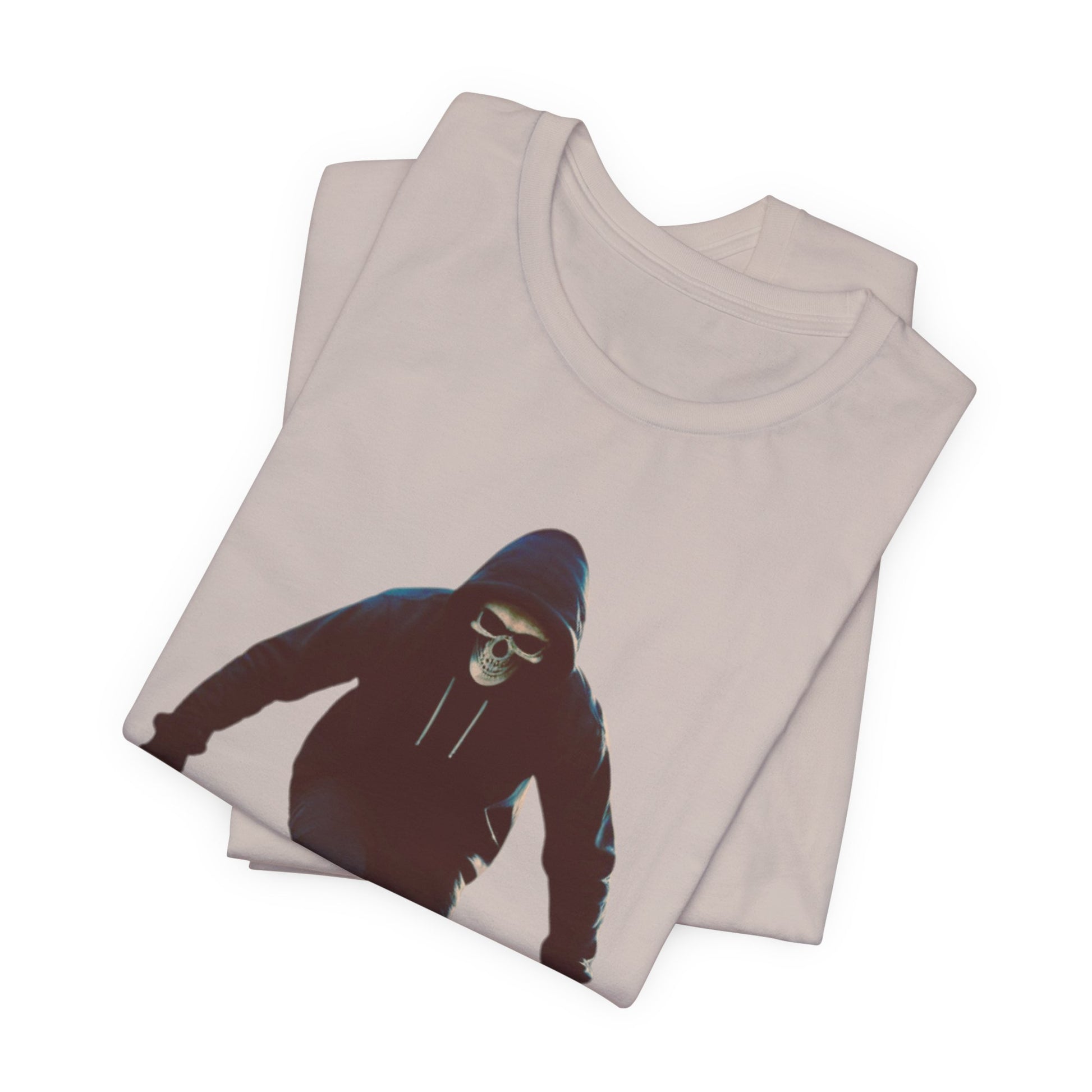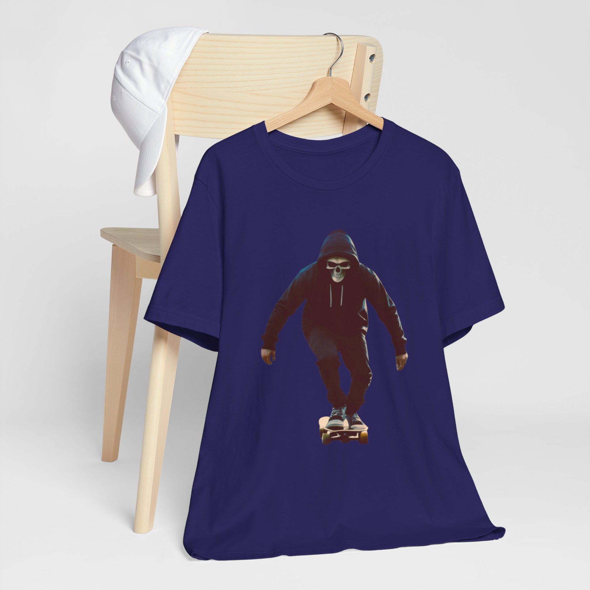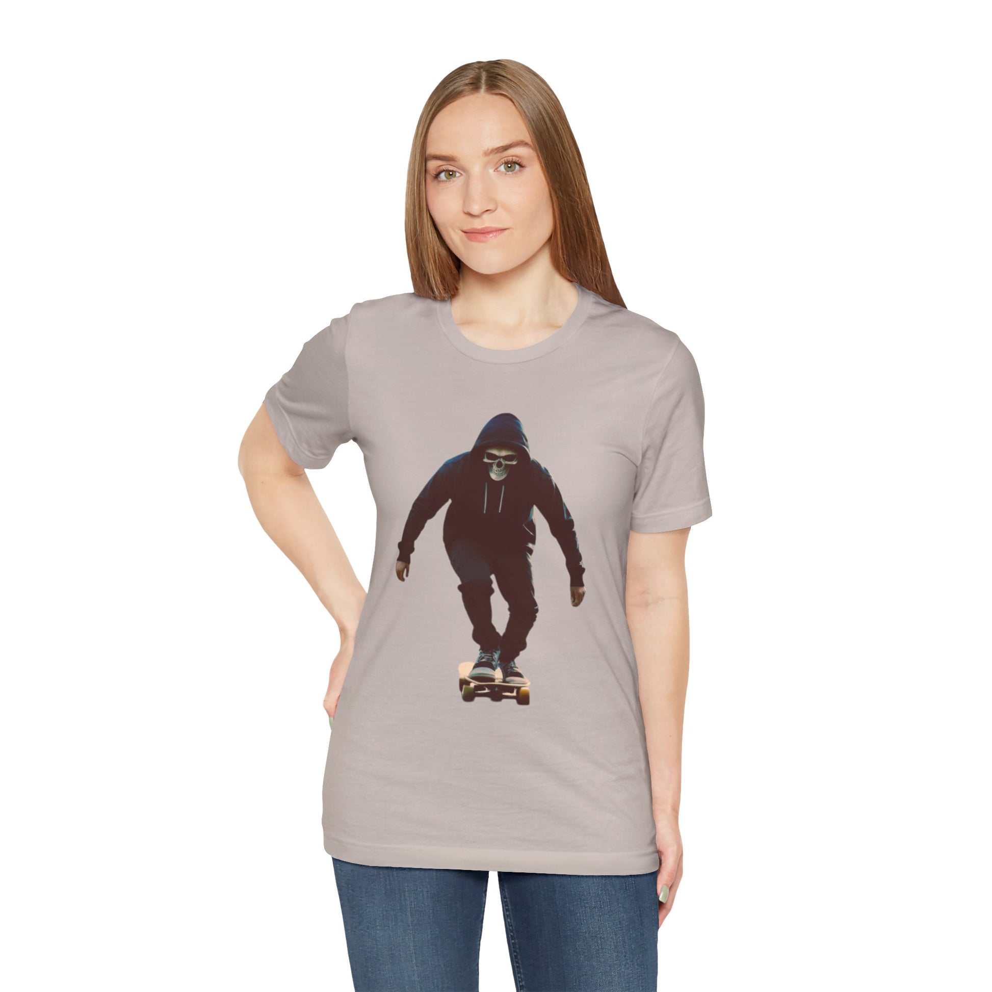 This T shirt brings that cinematic moment onto soft breathable cotton. A hooded skater in a skull mask glides through an empty city street, captured in bold graphic detail. The design combines gothic edge with skate culture energy, perfect for those who want more than just a shirt—they want a story on fabric.
