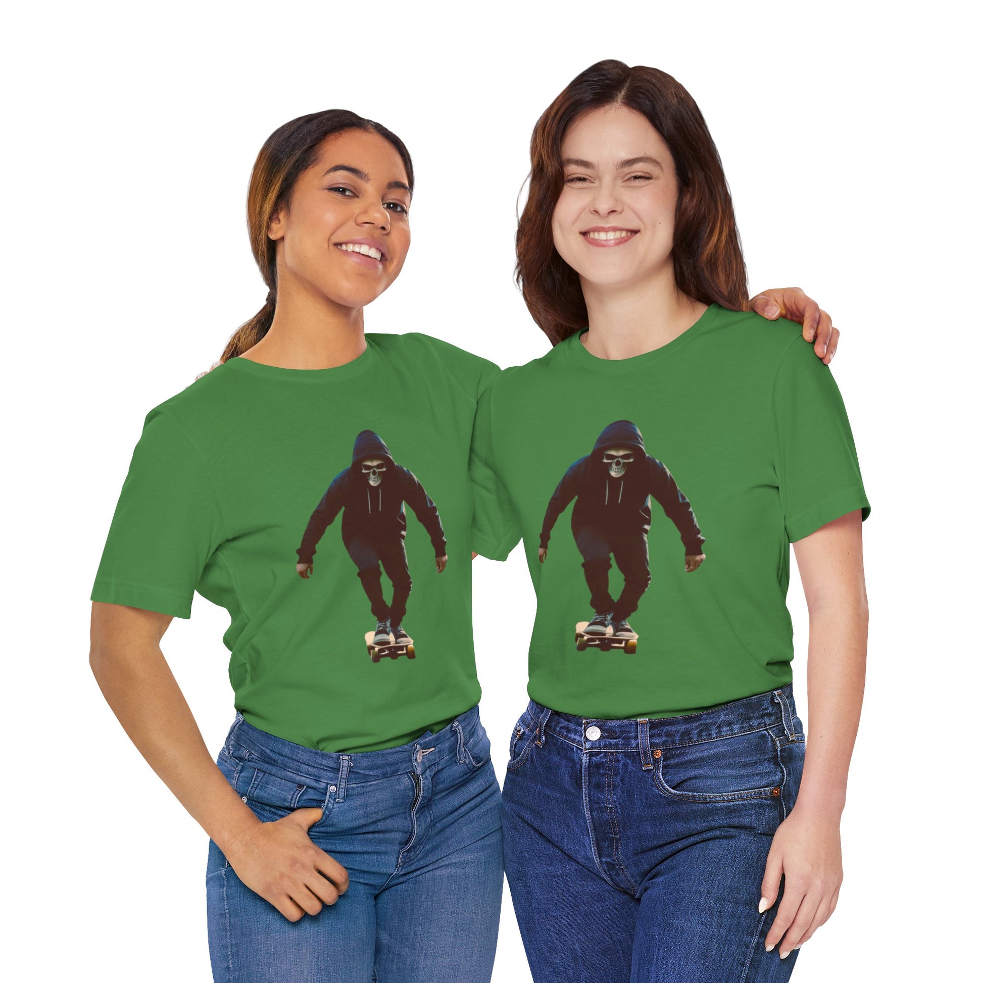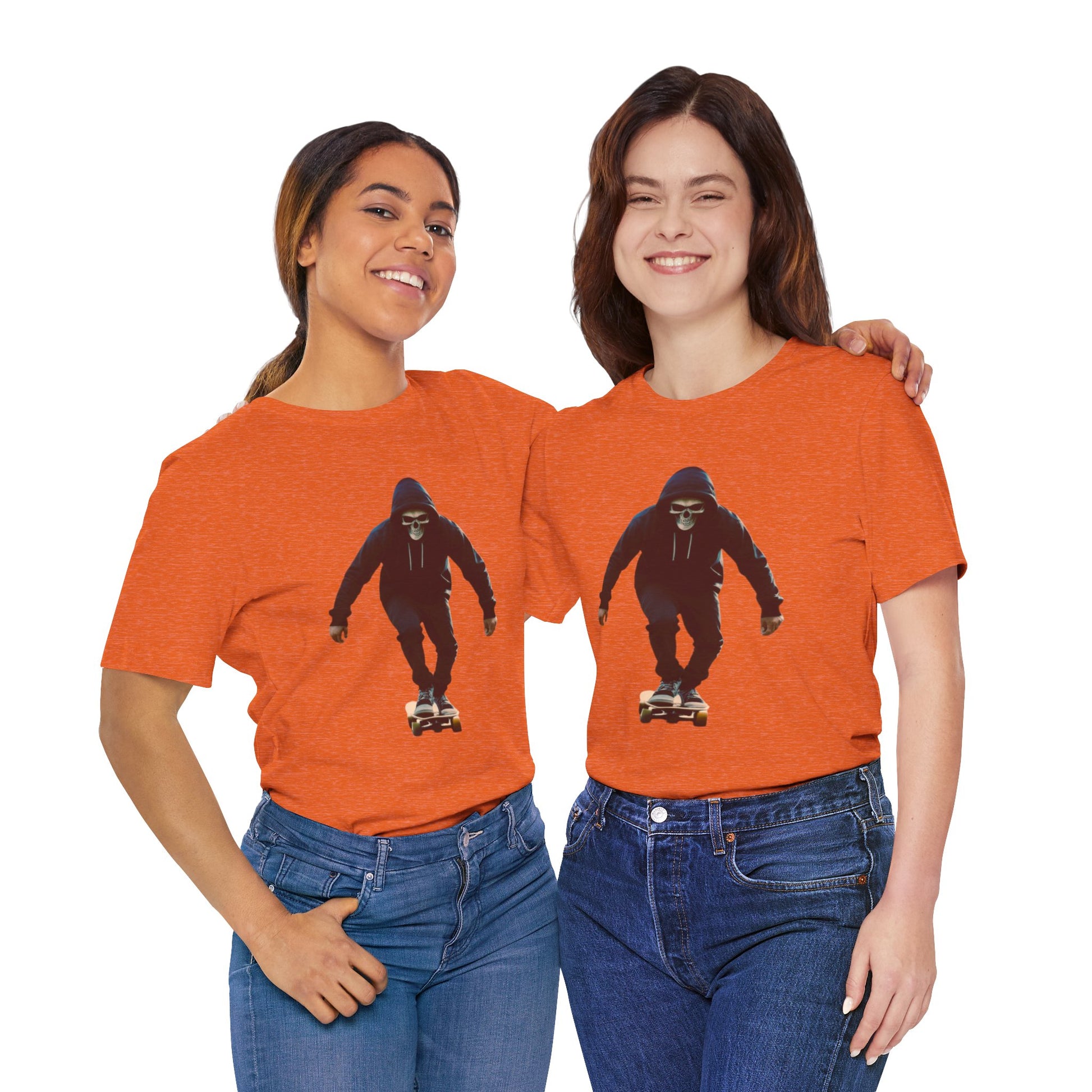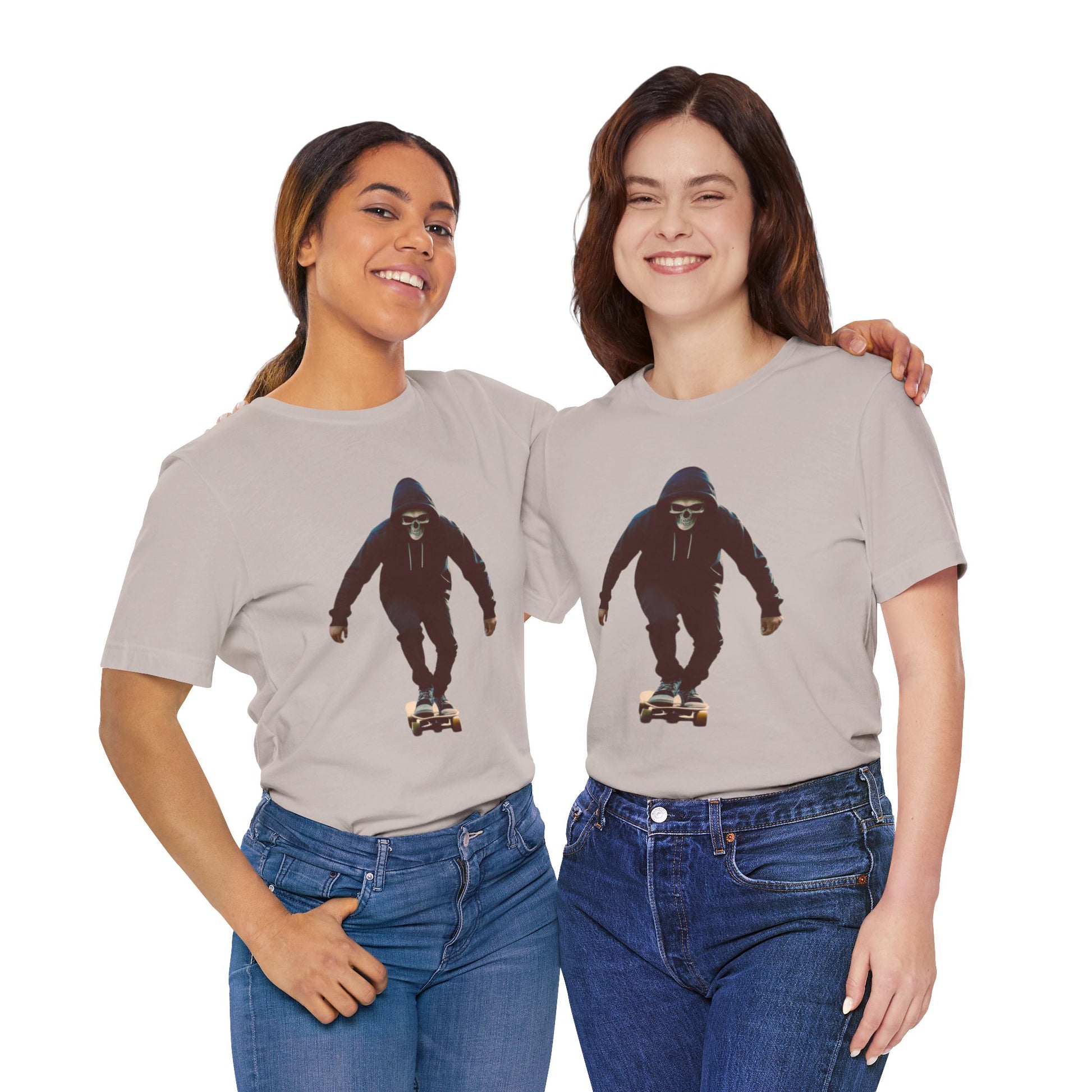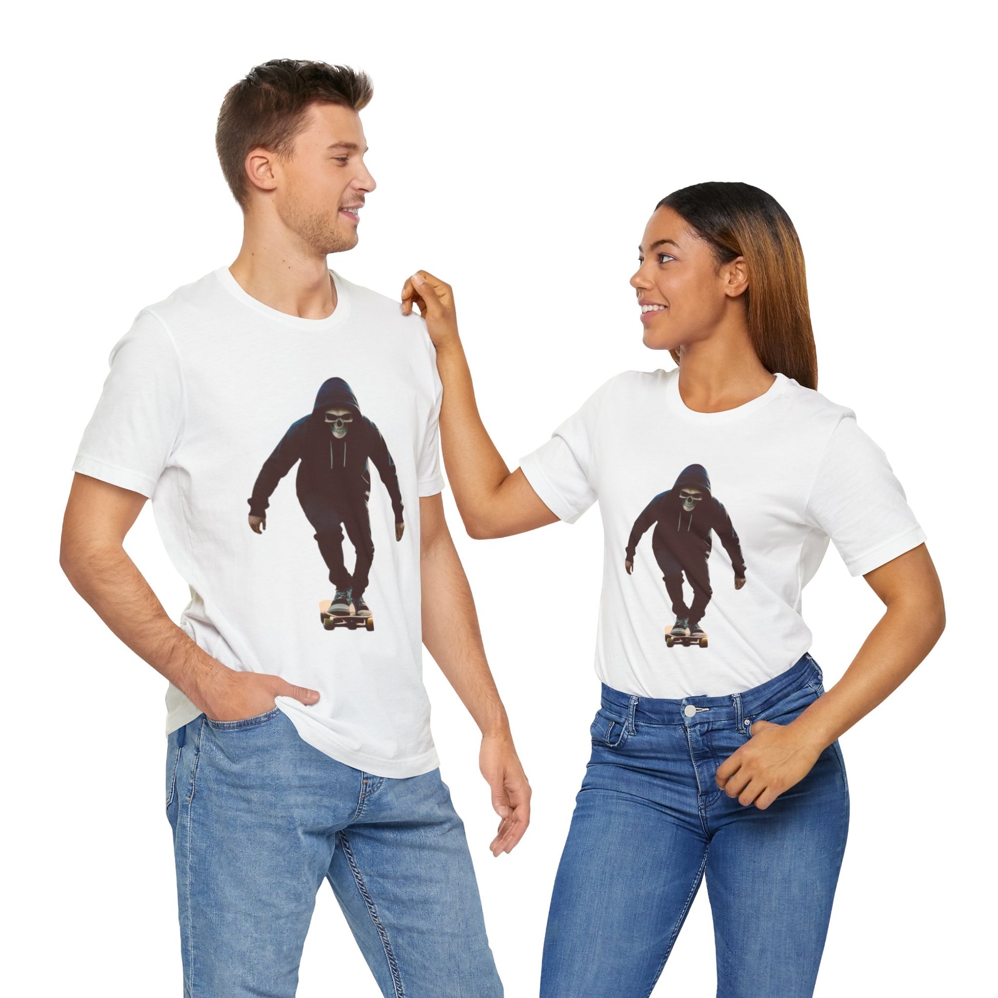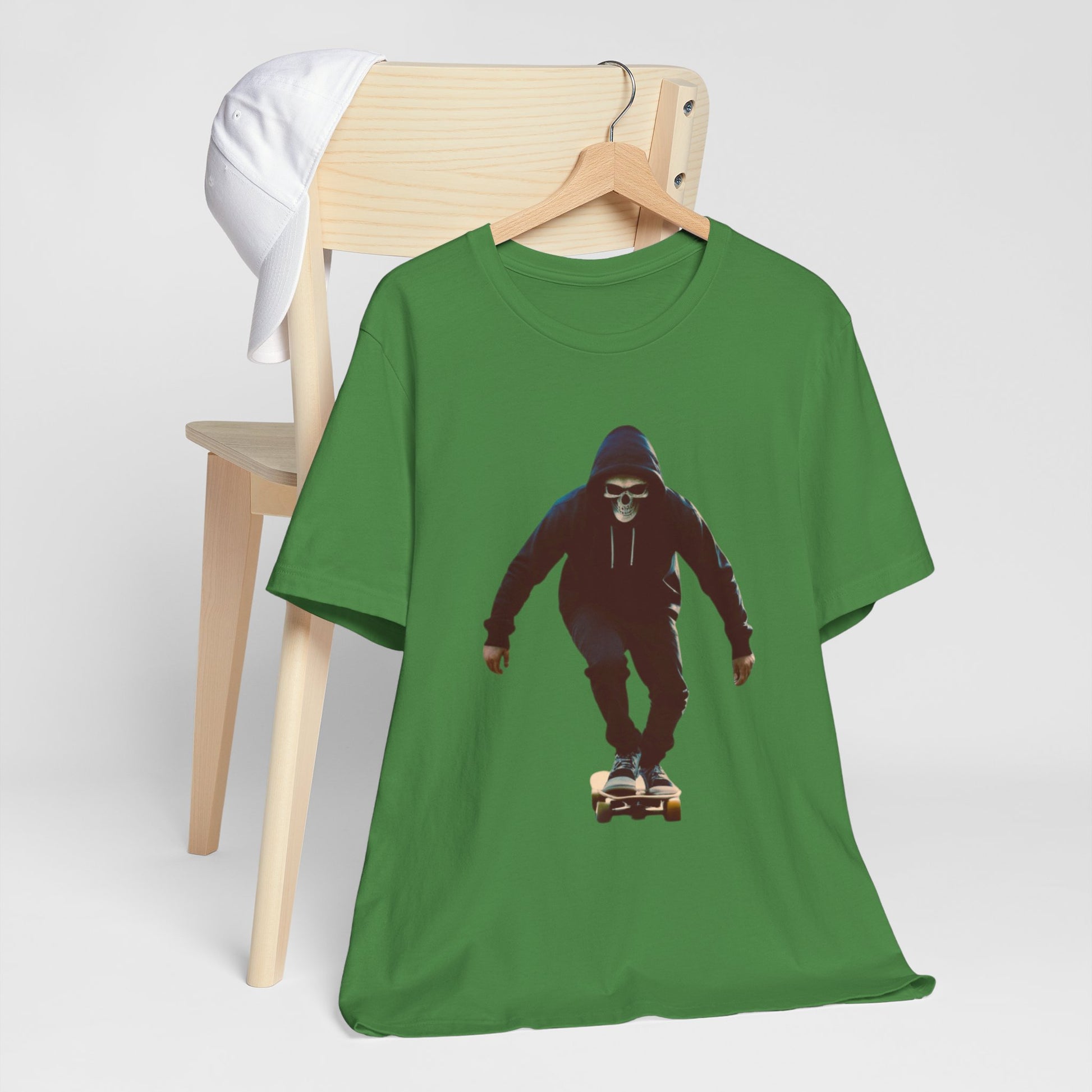 This T shirt brings that cinematic moment onto soft breathable cotton. A hooded skater in a skull mask glides through an empty city street, captured in bold graphic detail. The design combines gothic edge with skate culture energy, perfect for those who want more than just a shirt—they want a story on fabric.