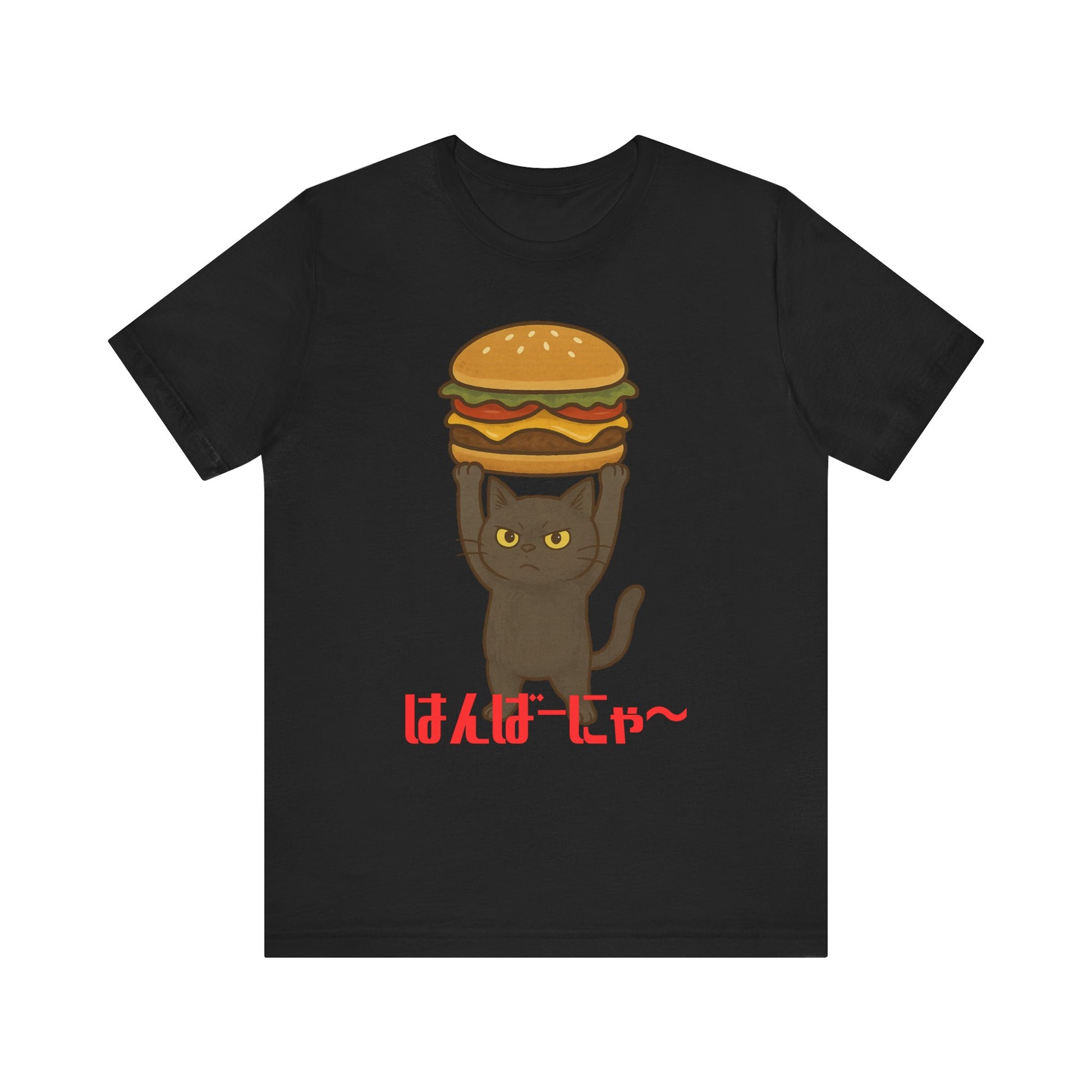 "Hanba-nyaa~" Cute Japanese Cat T-Shirt – Funny Burger & Cat Design – Kawaii Style Unisex Tee – Gift for Food & Cat Lovers